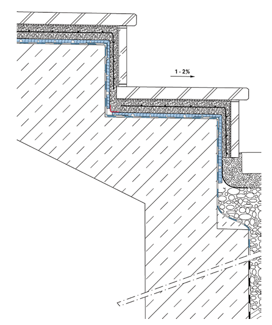 타설 할 때 계단의 외부쪽에 물턱을 두어야 합니다. 즉 건비빔의 높이 만큼 물턱을 두어서 빗물이 옆으로 넘어가지 않도록 해주고, 콘크리트 표면과 물턱을 덮는 방수층을 형성해야 합니다.