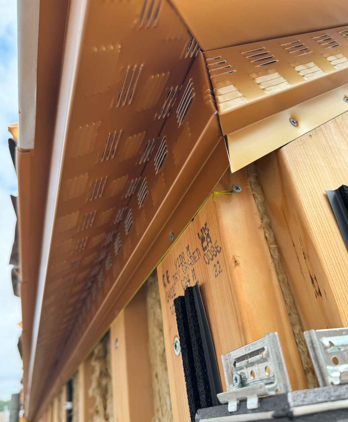처마는 외벽 마감에서 13cm 정도 돌출되어 있고, 추가로 BB거터가 15cm 가량 더해져 처마길이는 28cm 정도 돌출되게 됩니다. 벽체 배기와 지붕 흡기를 위해 통기구는 최대한 많이 뚫어주었습니다.