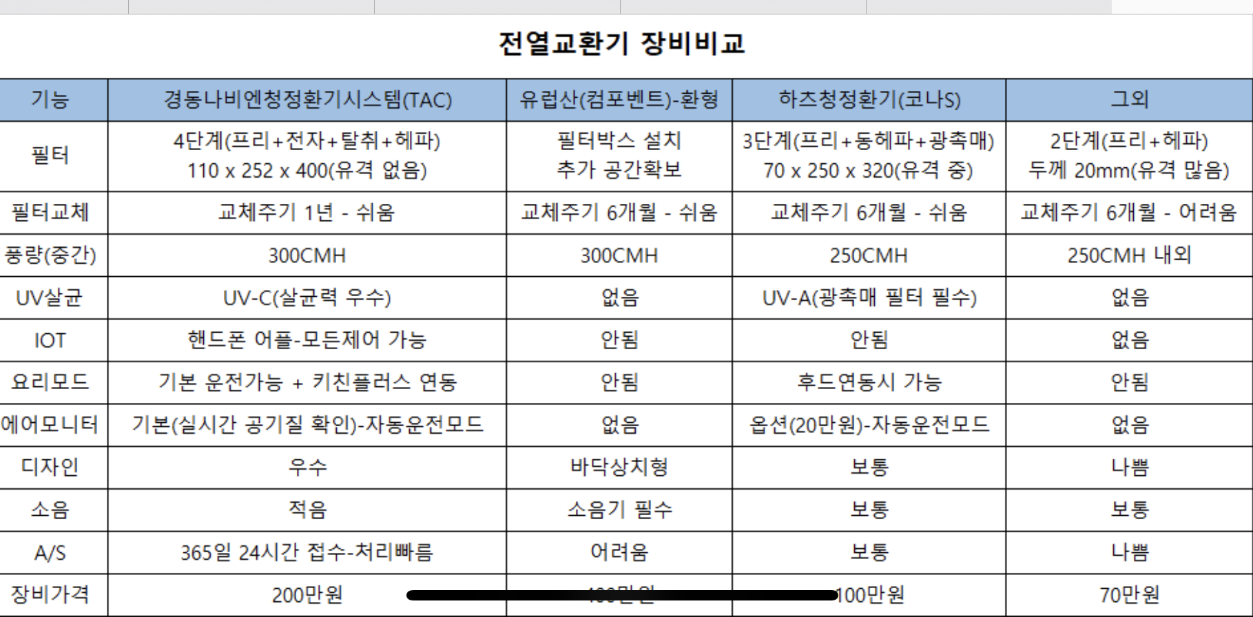 프리히터가 없는 문제는 아예 언급이 없네요. 근데 음압 문제에 대해서는, 최초에 공기압 체크를 한다고 하는데요. 요리할 때는 양압으로 만들어서 주방후드쪽으로 공기가 나가도록 유도한다고 하고요. 경동나비엔 공기청정시스템(?)에 대해서 어떻게 보시는지 궁금합니다. 비교표만 보면 소비자들은 경동제품이 더 좋구나라고 생각할