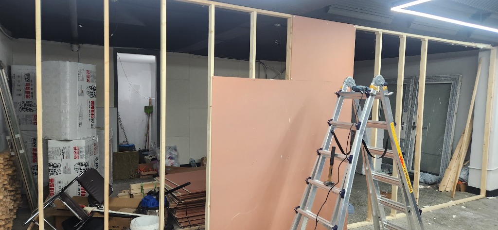 그리고, 벽을 사이에 두고 소리가 넘어가면 안되거나 기밀시공이 되기를 원하시면 석고보드 두 겹 중에서 첫번째 석고보드를 시공한 다음.. 석고보드와 석고보드 사이의 틈새와 석고보드와 천장 바닥이 만나는 선을 따라서 기밀테잎을 붙여 주어야 합니다.