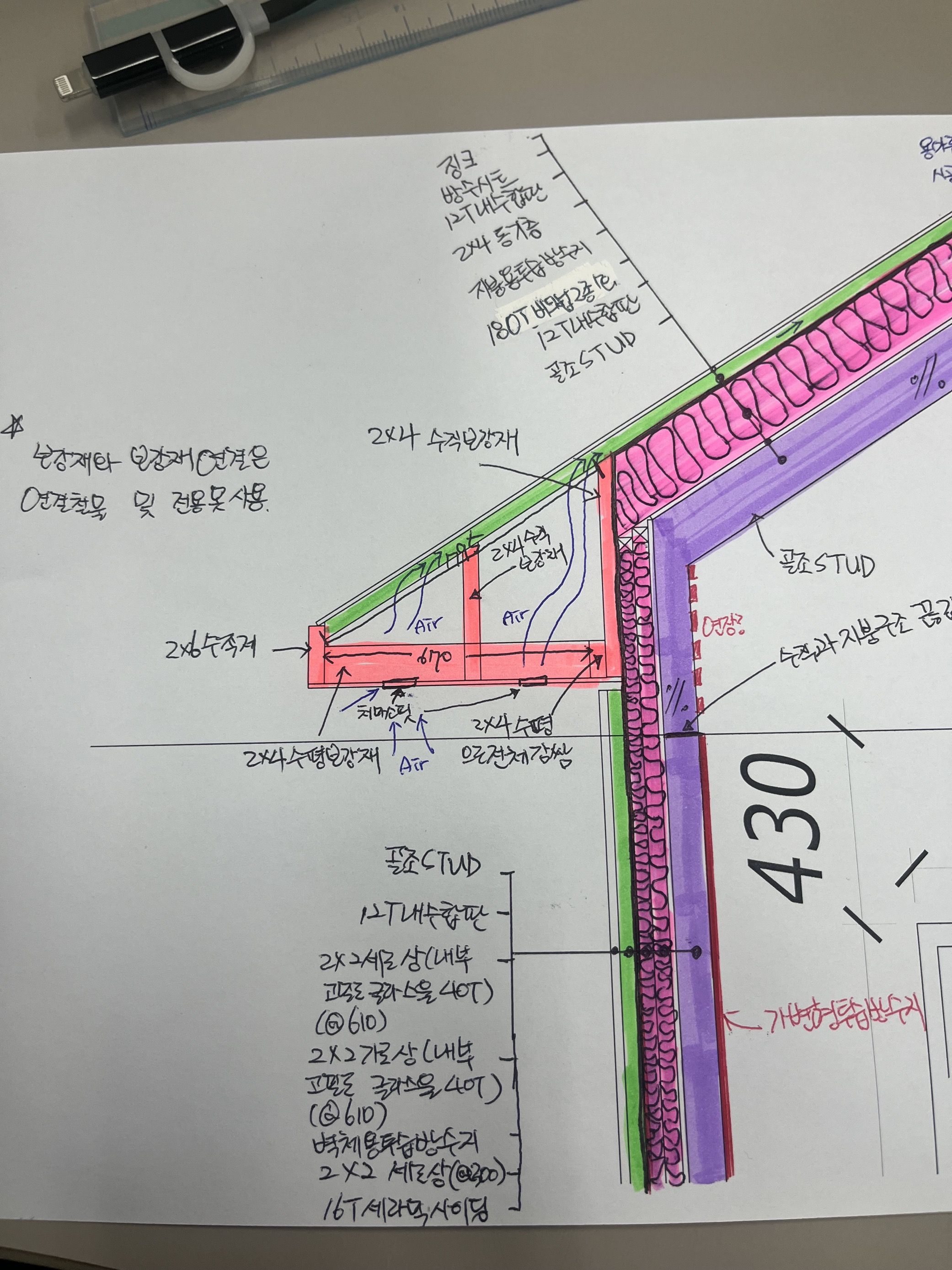 여기서 궁금한 사항이 내부의 가변형 투습방수지를 시공해야된다고 알고있습니다.(여름에는 벽체를 통한 외부의 습기가 실내로 유입되도록하고 겨울철 내부의 습기가 구조체로 전달되지 않도록 방습을 통하여 구조채 내부의 습기가 정체되지 않도록 한다고 알고있습니다.) 저의 경우처럼 벽체와 지붕까지 연결 시공 시 실내측의 가변형 투습방수지의 설치는 어디까지 해야되는지요?
