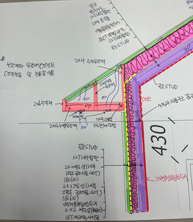 짙은 노란색이 기밀층입니다. "연장?"이라고 적으신 외벽 부분의 하자를 막기 위해서는 실내층에 가변형방습층이 개입되어야 합니다.