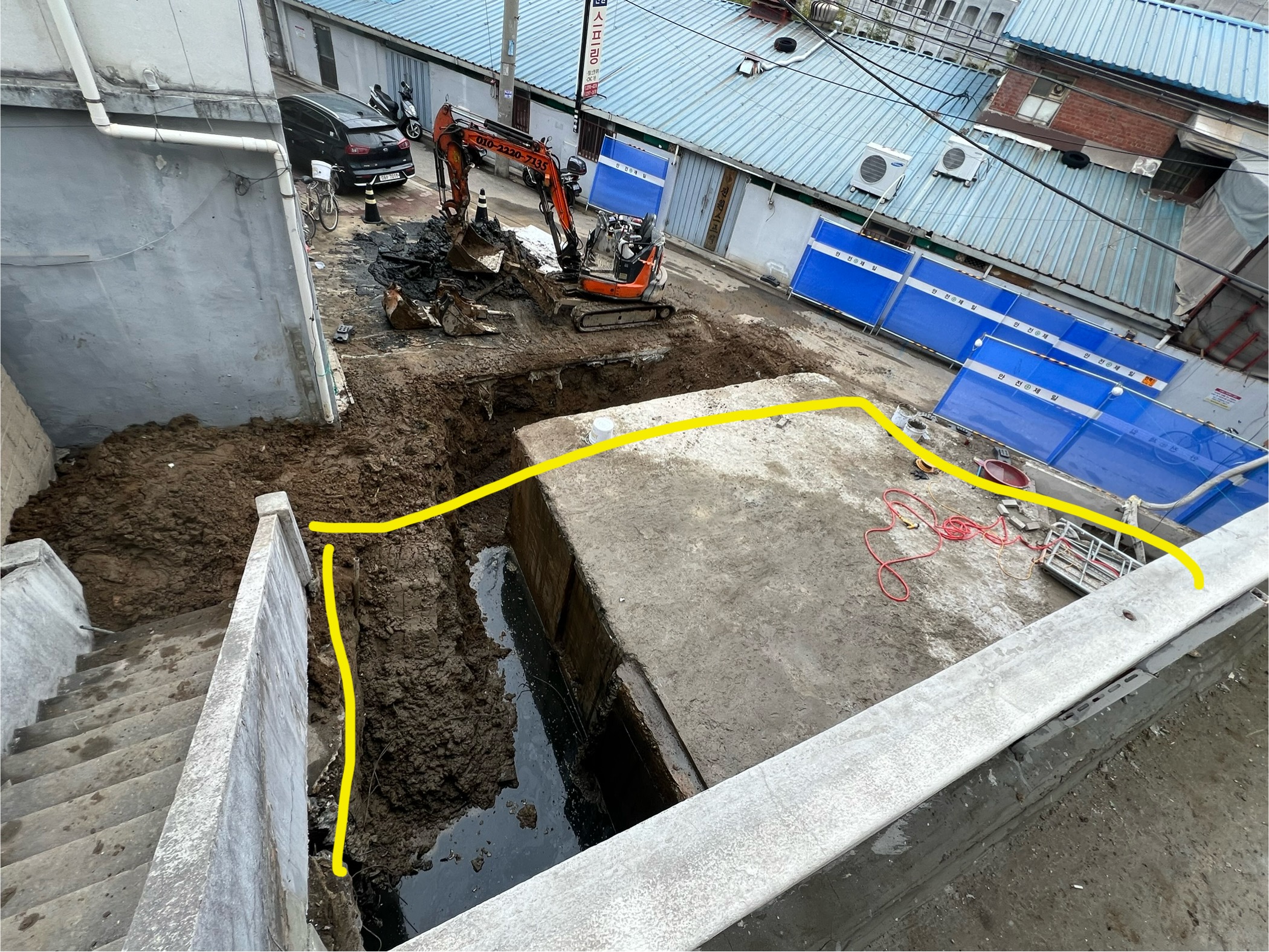 콘크리트 폐기물을 묻어 기존 정화조 1서에 사람이 들어가서 배관 작업을 할 수 있도록 만든 이후, 신규 정화조 인입관 연결 작업을 기존 정화조 1서에서 진행하려고 합니다.