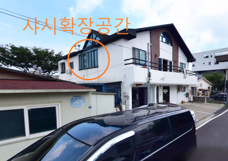 그리고 반대편 공간(서향)도 그쪽으로 비가 못 들어가게 하기 위해 1층에서 여기는 2층 시작점까지 단열이 되기 힘든 공간입니다. 샌드위치 판넬처리가 되어있습니다. (이 부분은 철거 후 시공은 가능합니다.) 또한 계단실이 있는데, 여기는 약간 오픈된 공간이어서 비가 들어오는 관계로 샤시 확장처리가 되어있습니다. 외단열을 선택해도 여기를 마감하는 과정이 선뜻 생각나지 않습니다.