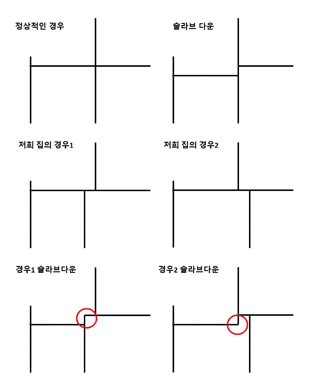 일조권사선제한으로 생긴 베란다를 역전지붕 형식으로 만들어 보려고 슬라브다운을 하려고 하는데요, 마음은 먹었는데, 잘 몰라서 고민이 있습니다. 정상적인 경우 벽이 일치하면 맨 위 오른쪽 그림같이 되는데, 다가구 주택의 특성상 층마다 평면이 달라서 윗층과 아랫층의 벽이 일치하지 않는 곳이 많습니다. 그래서 가운데 그림 처럼 아랫층 실내벽이 더 외벽쪽으로 가거나 (두번째 줄 그림상 왼쪽), 더 안쪽으로 가게 됩니다(그림상 오른쪽). 그러면 슬라브 다운을 할때 세번째 줄에 있는 그림처럼 돌출부위나 안으로 들어온 곳이 생기는데요 (붉은 원). 이렇게 되는 경우에 문제가 없을까요?