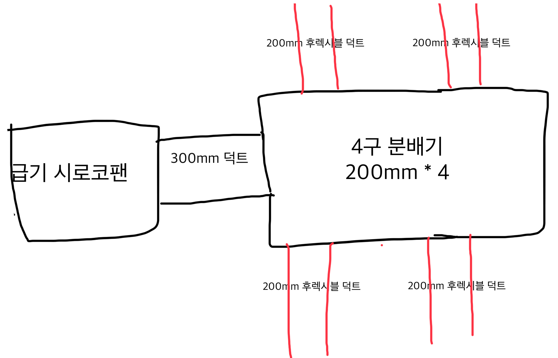 각 배관의 길이를 몰라 확답드리긴 어렵습니다만 분배기에 200mm 배관을 추가하는 것만으로 풍량확보가 용이할 것으로 보입니다. 만약 메인배관의 길이가 길다면 메인배관의 구경을 350mm로 확관하는 것도 고려하셔야 합니다.