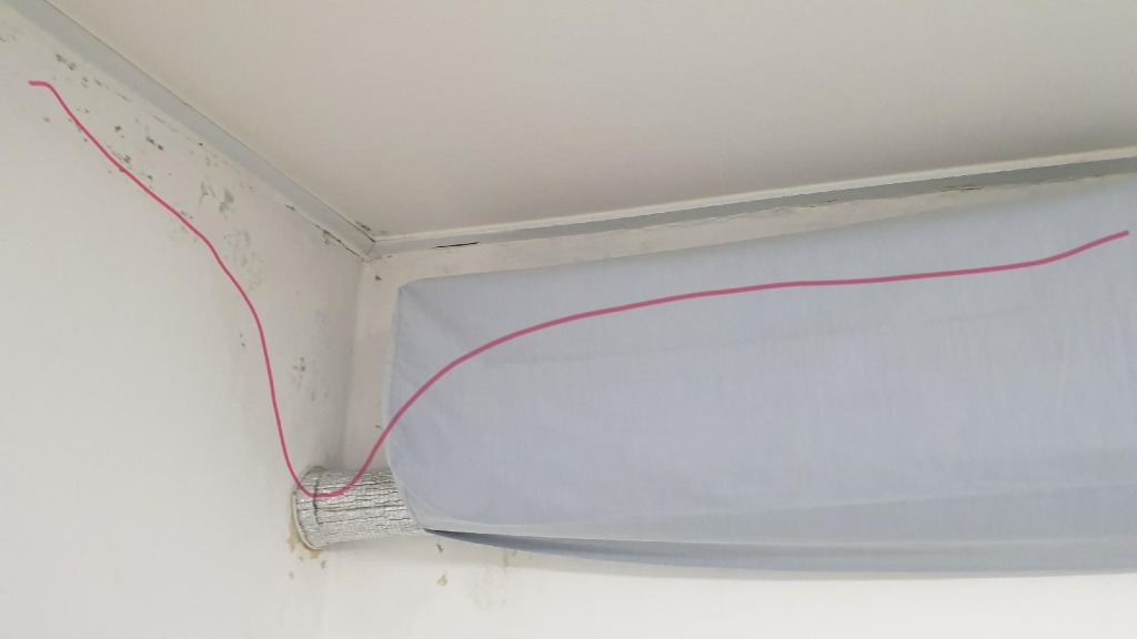 한 가지 또 의문인 부분입니다. 천장을 직접 보진 못했으나 환기캡의 위치가 벽걸이 에어컨 위 지붕의 안쪽에 있는듯합니다. 따로 에어컨, 보일러, 주방 후드 및 환풍기 등과는 무관한 위치에 있습니다. 여기 글들을 여럿 보아 추측하면 예전 건물의 공기구멍의 용도로 만들어 놓은 듯합니다. 해당 건물의 다른 방과는 다르게 유독 이 방만 저 위치에 환기캡이 있습니다.