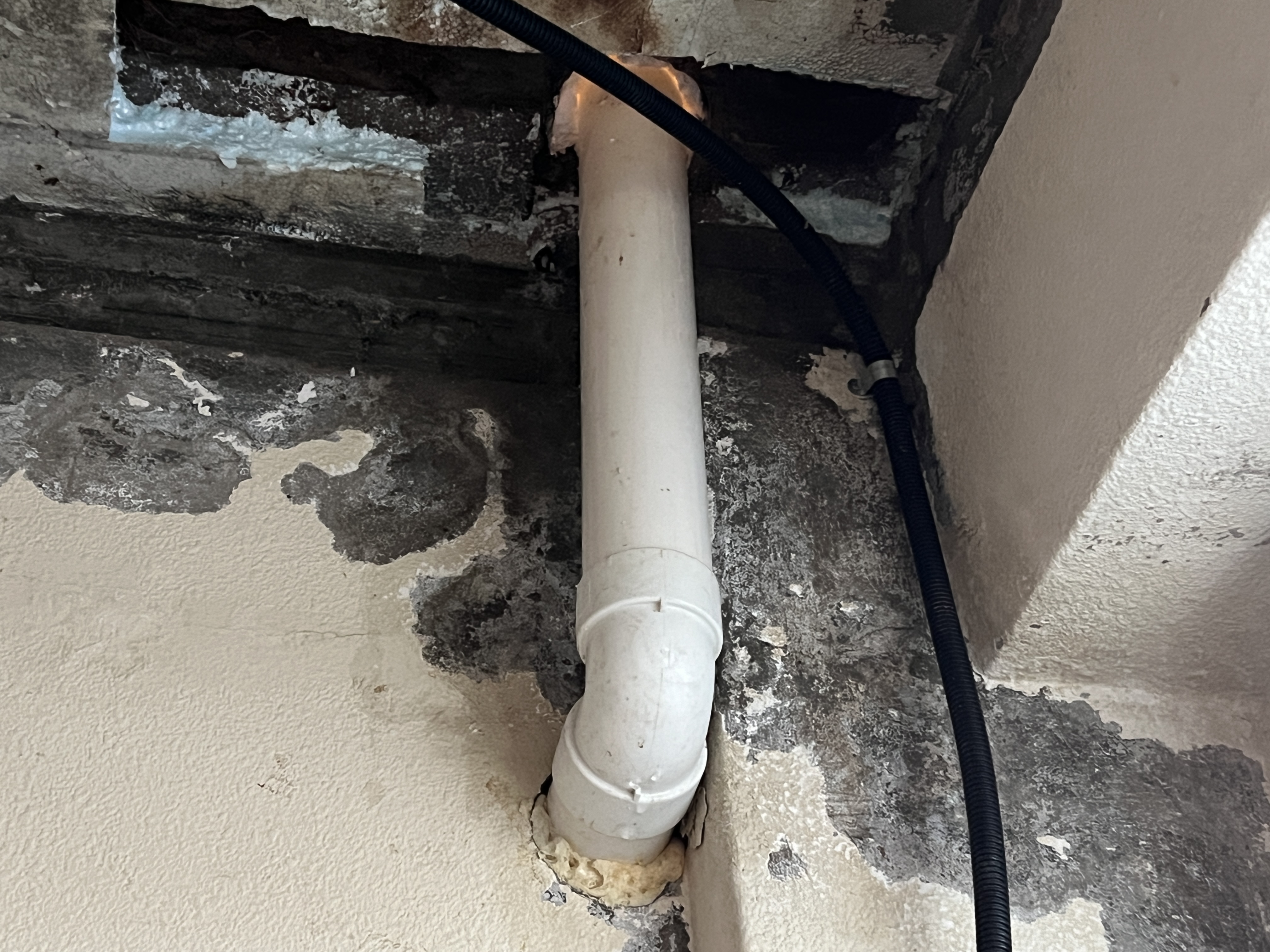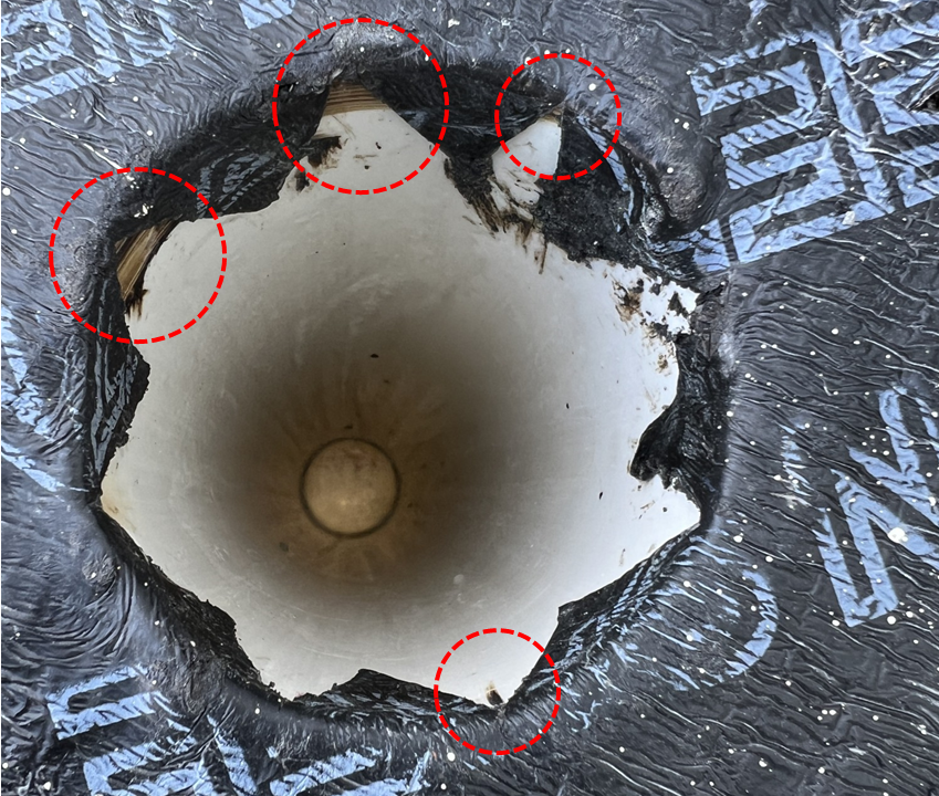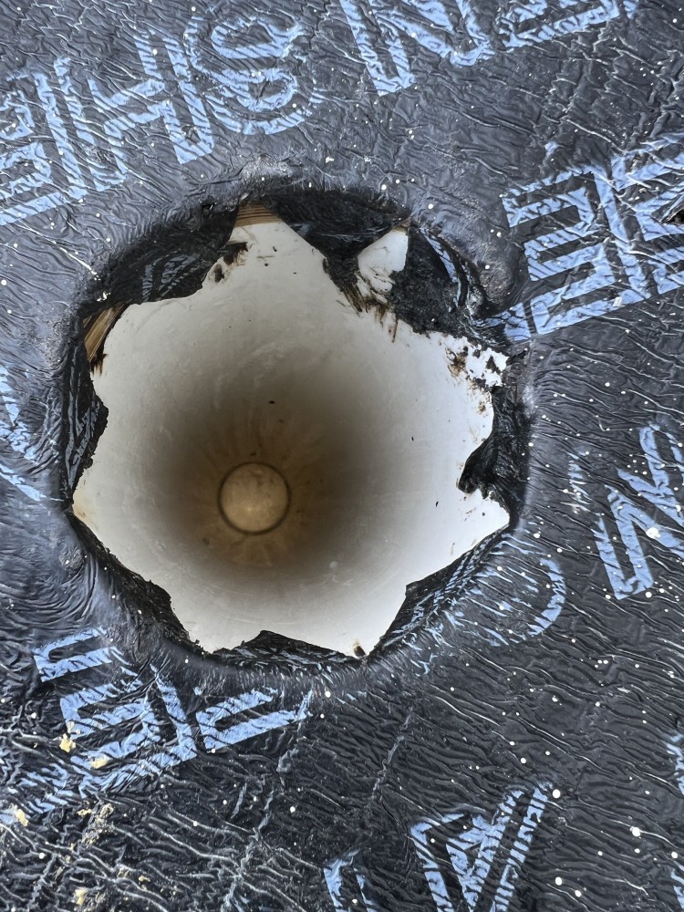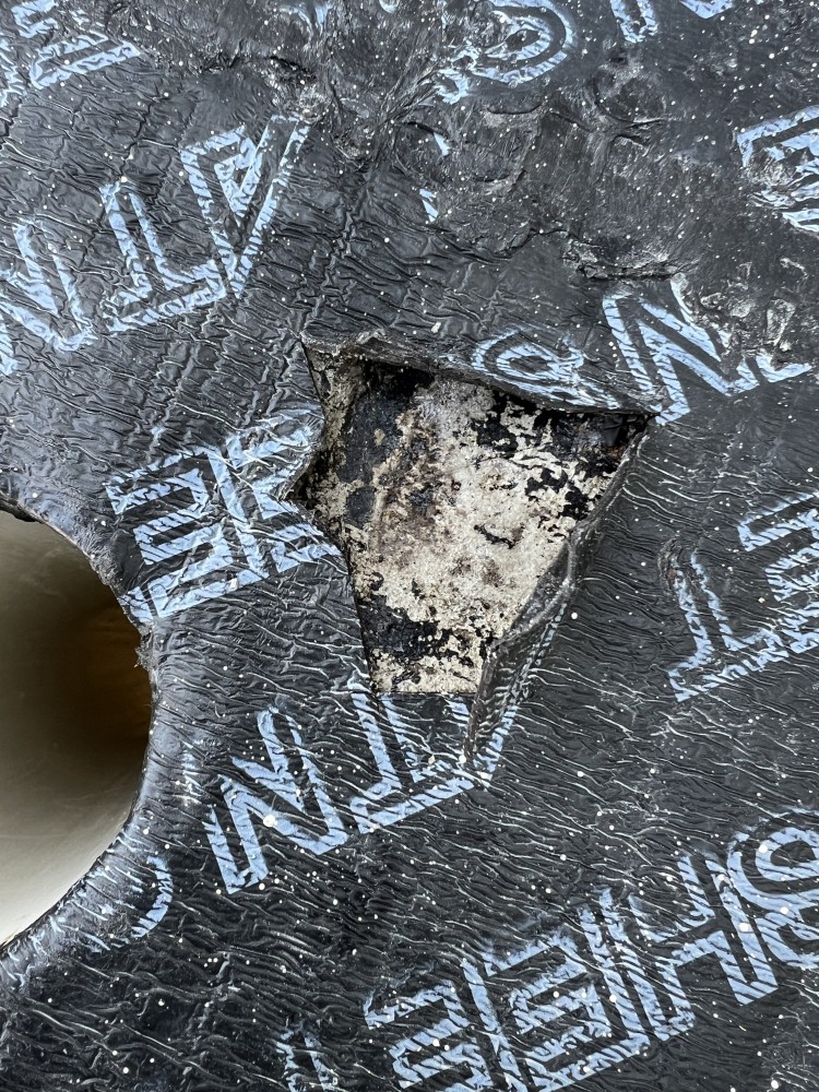 아래 사진에서 표시된 부분처럼.. 방수시트가 배관을 다 덮지 못해서 틈새가 있다는 의미였습니다.