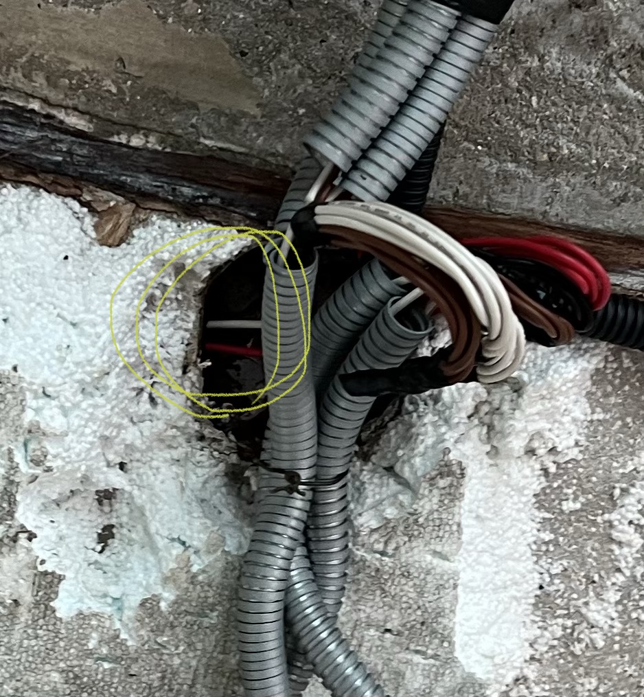 사진이 작아서 잘 안 보입니다만, 대부분의 전선은 거실에서 벽 타공해서 들어왔어요. 두 가닥 전선이 외부등인데, 기존 천정 슬라브에 매설된 관을 통해 밖으로 나갔습니다. 이럴 경우 결로로 인한 누수 위험이 있을까요?