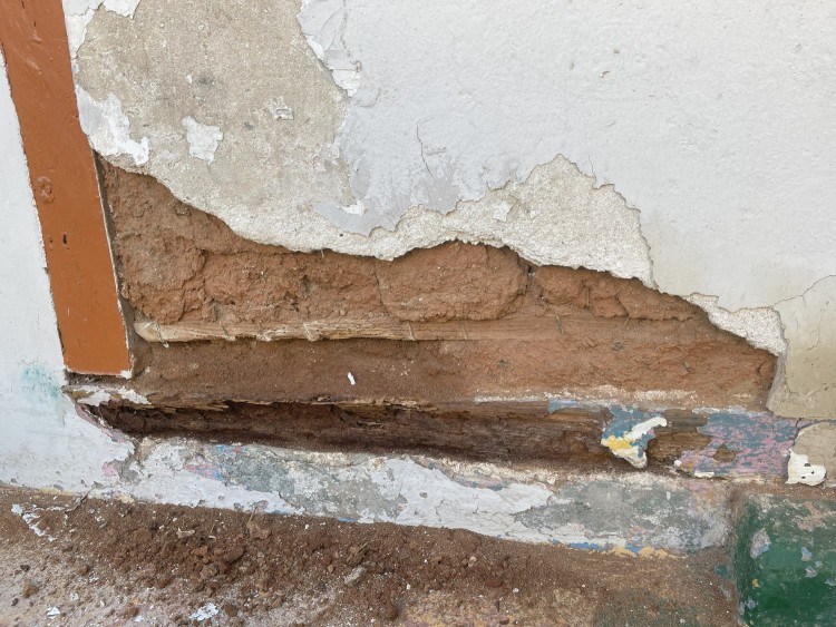 빗물이 바닥에서 튀어서 벽 하단의 목재를 적시고, 그 젖은 목재의 빗물이 흙속으로 침투를 한 결과입니다.