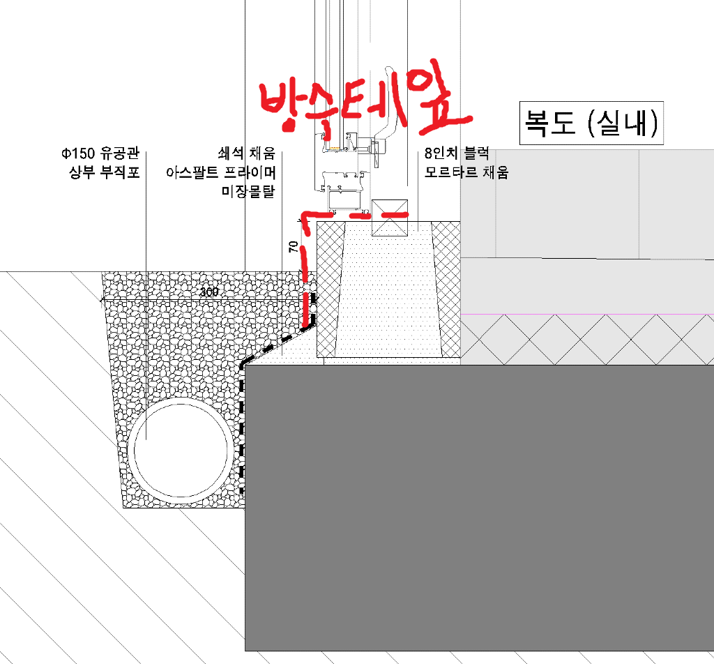이에 따라 기초 상부를 미장 몰탈로 법면 처리하고, 블록 측면부터 기초 측면까지 아스팔트 방수를 시공하려 합니다. 다만 블록과 기초 사이에서 누수·습기 문제가 생길까 우려되어 문의드립니다.