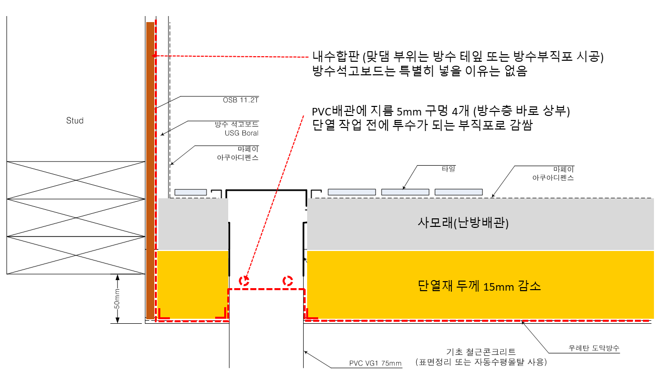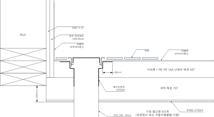 콘크리트 - 방수(이중배수면, 벽까지 치켜올림) - 단열재 - 방통30mm (난방배관) - 방수(벽의 내수합판까지 연결) - 사모래 - 타일