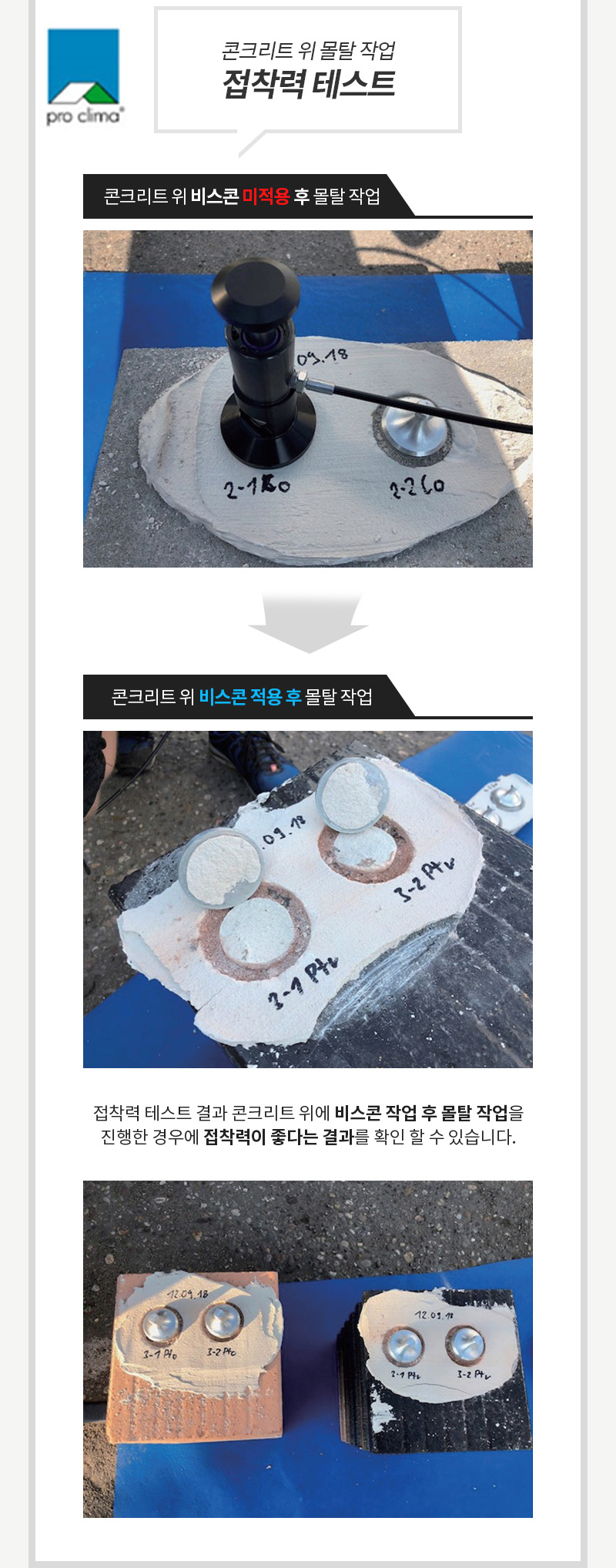 추가로 테이프 위에 미장작업을 위해서 전용접착제(탄성도막가변형방습제-비스콘)을 도포해주시는 것이 미장접착력을 올릴수가 있습니다. 아래 사진은 비스콘작업을 한 것이 미장 접착력보다 좋게 나오는 테스트오니 참고하시면 되겠습니다.
