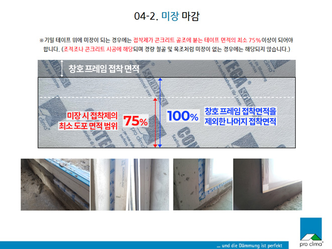 사용하셔서 접착을 하셔야하며 접착제 도포범위가 테이프가 골조 접착부위의 75프로 이상