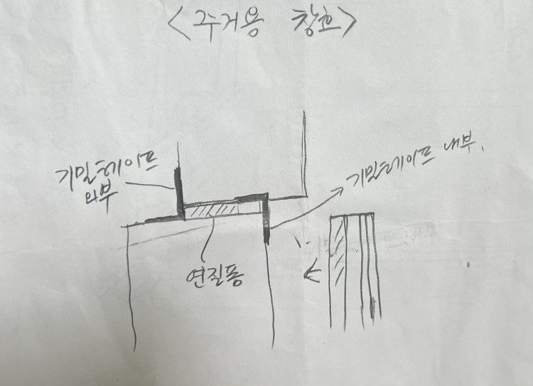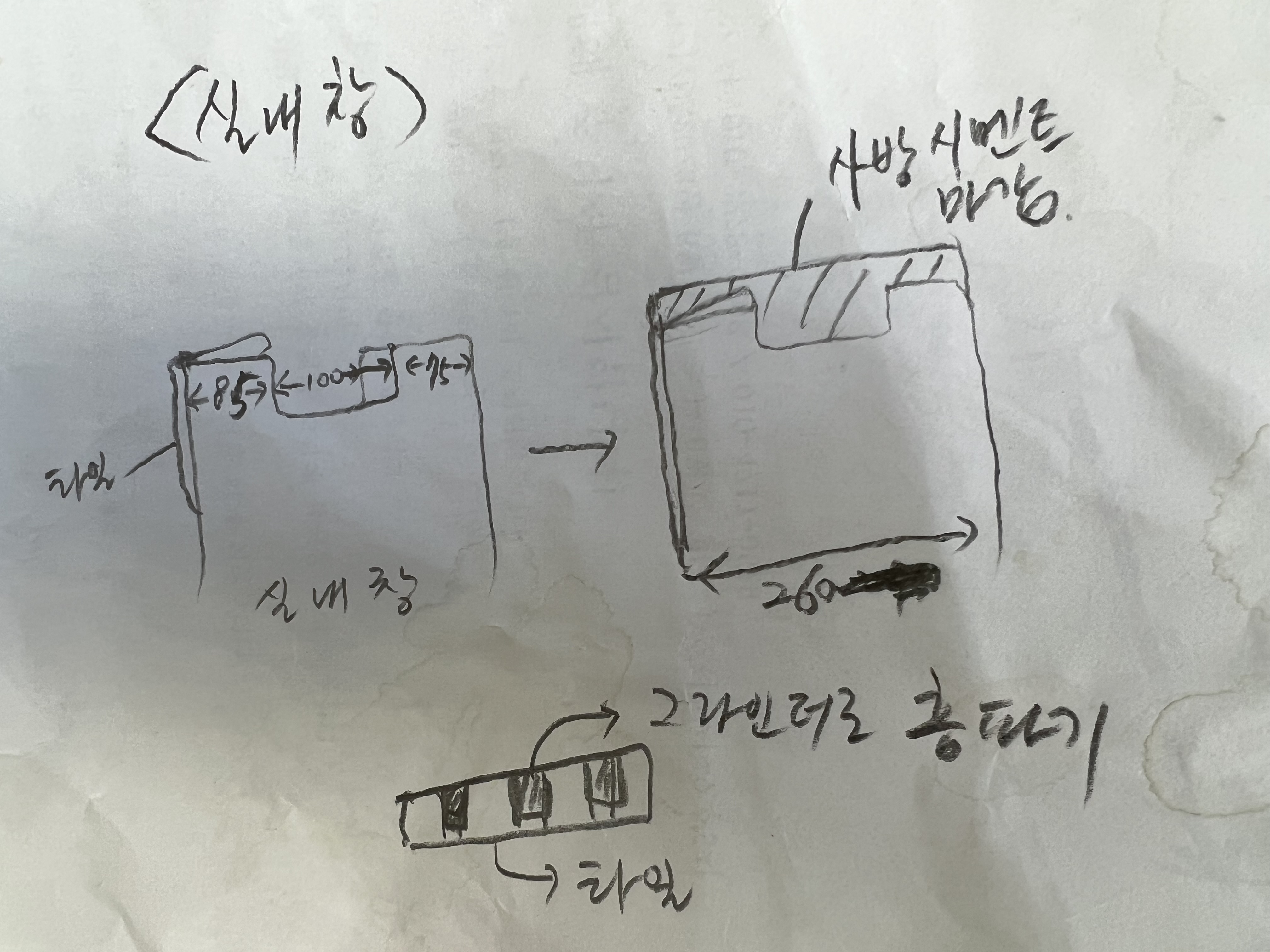 2. 창틀의 위치를 어디로 잡아야 할까요? 오른쪽 그림 상 A부분인데, 몇을 띄우고 앉혀야 할지 모르겠어서요. 기밀테이프가 밖으로 나가는 부분이기도 하고요.