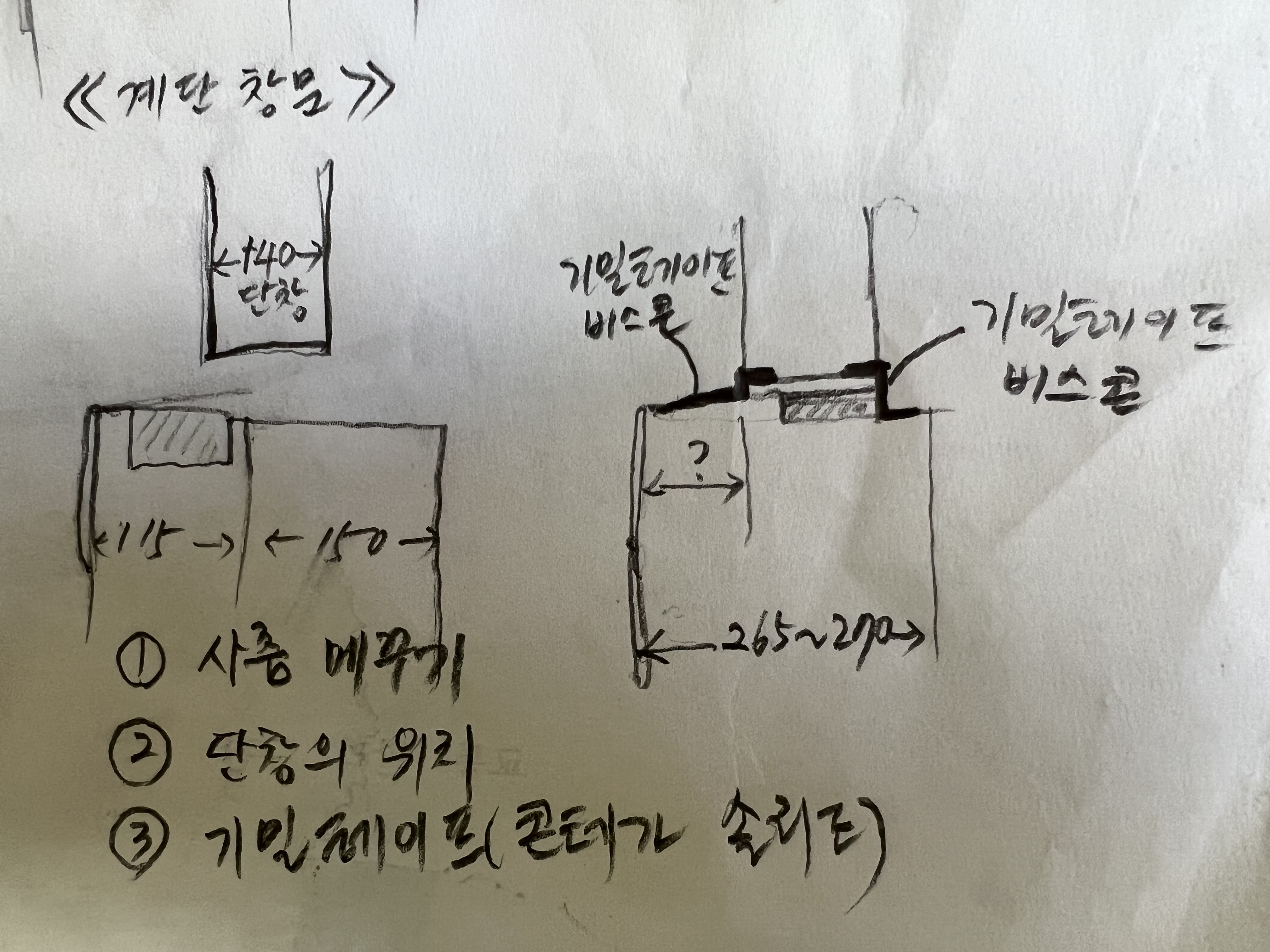 우선 계단쪽 창쪽은 내부의 타일이 없어서 시멘트로 메꾸면 될 듯 한데요. 창쪽 벽의 너비는 총 265~270정도이고, 단창 140틀이 앉혀집니다.