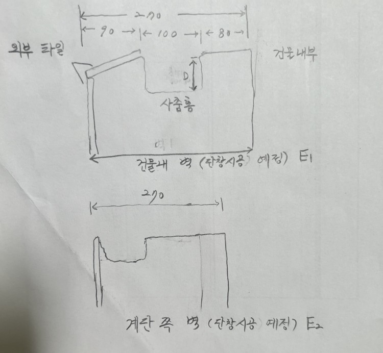 미장 반장님이 타일면이라 시멘트가 잘 안 붙는다고 하셔서, 아래 그림처럼 타일에 홈을 파서 작업을 해보면 어떨까 싶은데요.