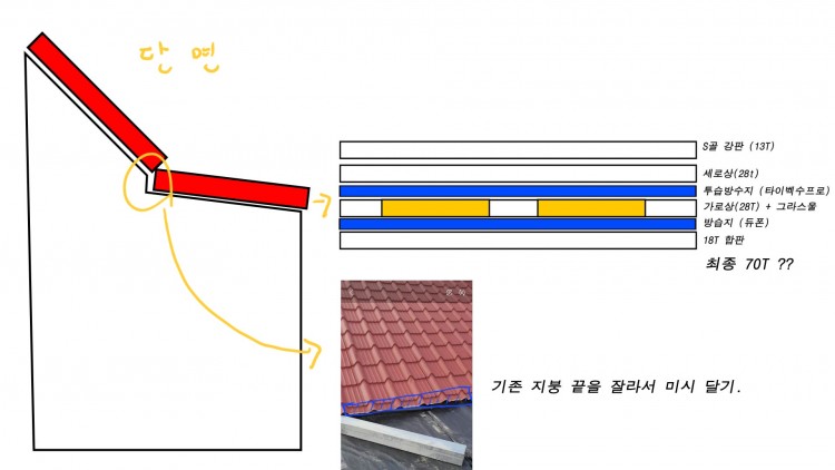 기존 지붕의 끝부분을 잘라내면 100mm 정도 여유 공간이 생길거 같습니다..