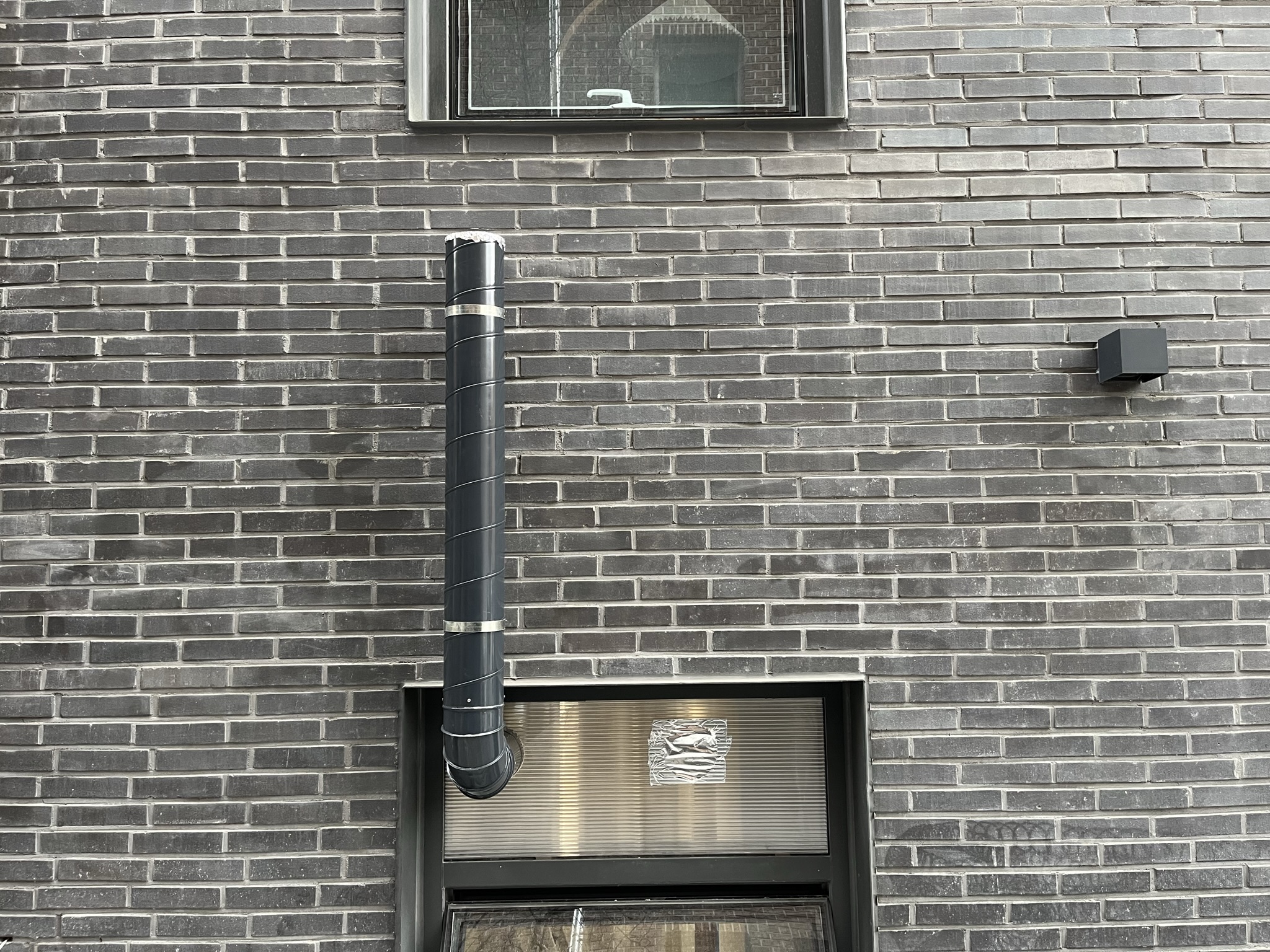 시공시 주의하실 부분은 배관 조인트 부위로 우수가 타고 들어갈 수 있으니 수평배관에 가장 낮은 부분에 임의로 구멍을 뚫어 배수가 가능하도록 해주어야 합니다. 혹은 유증기로 인한 기름을 배출하기 위한 드레인 부속을 사용하시면 좋습니다.