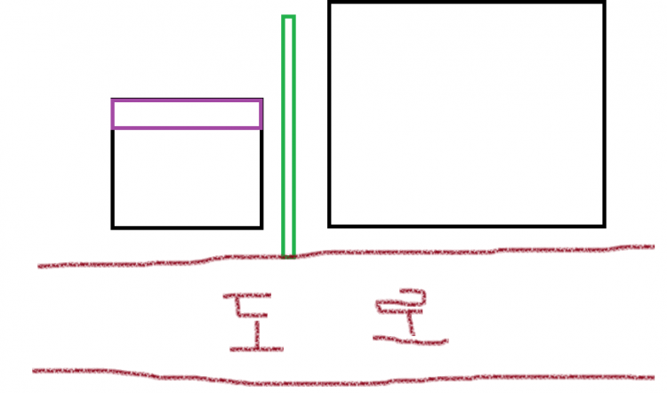 ** 위에서 내려다본 그림입니다. 보라색 부위(조제실)에 전열교환기 설치를 하고 싶습니다.   도로쪽으로 타공을 하기 위해서는  덕트관을 설치하기가 어려운 문제가 있습니다.