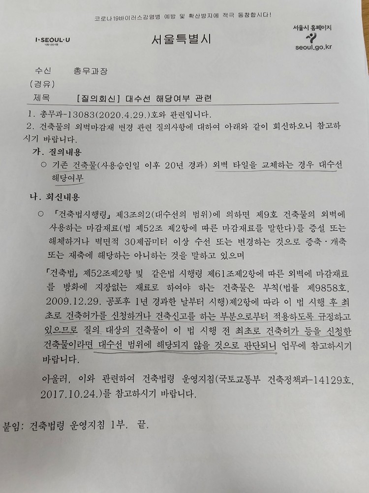 2010년이전 건물은 댸수선에  해당되지않는다는 법령과 서울시 민원공문을찾아