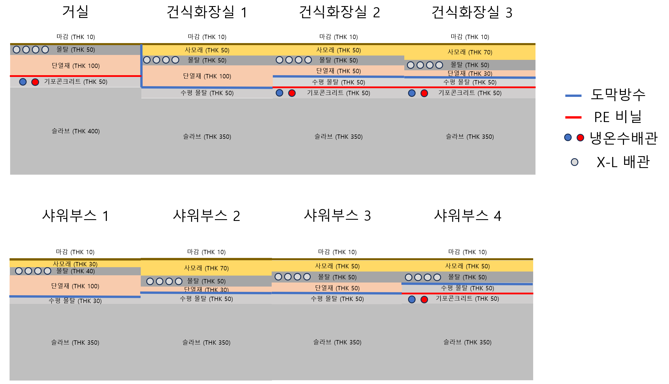 즉, 난방배관까지의 높이는 모든 화장실이 다 동일하고, 나머지 높이 차이는 사모래층의 두께만 변화 시키는 것이 유리합니다.
