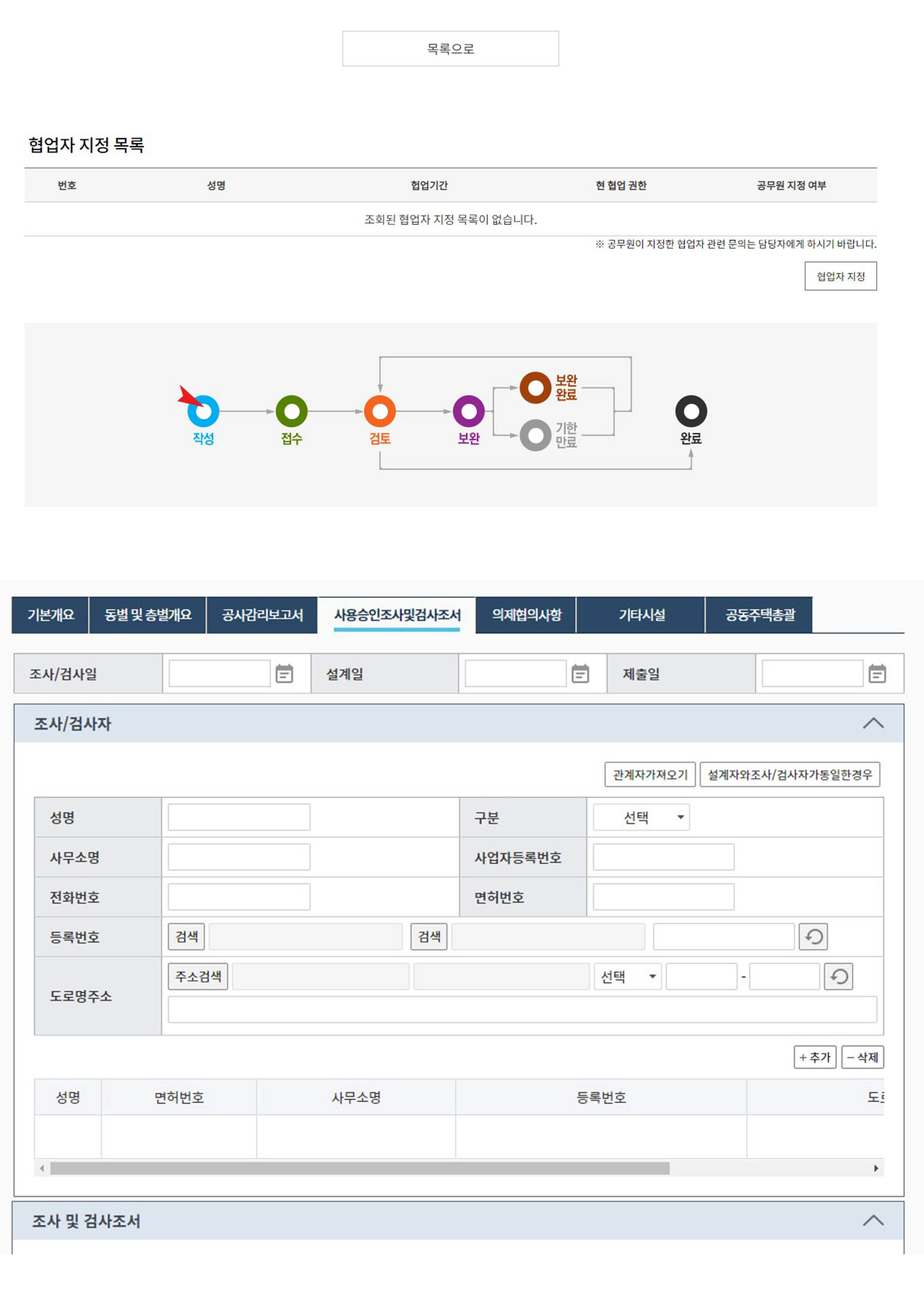 -> 목록에 추가된 협업자가 있는 지 확인(주무관이 선정된 건축사를 지정하여 추가시켜놓습니다.)