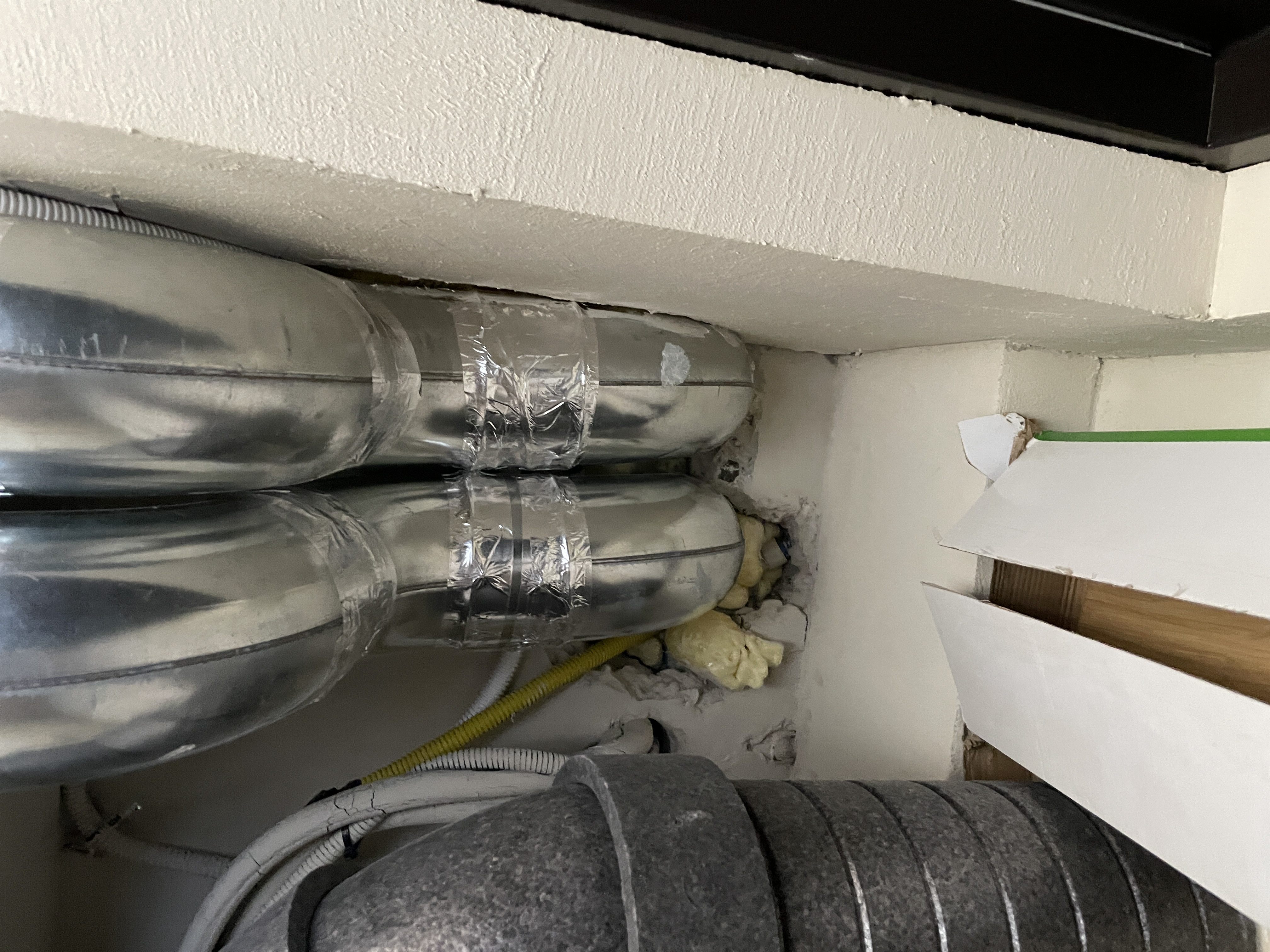 손이 들어갈진 모르겠습니다. 사다리로 올라가서 봐야할 것 같아요. 이게 지금 보이는 천정 윗층 PS실에서 젠더 배관 설치 후 마감을 폼으로 한 건데요. 그 폼이 아래쪽에서 볼 때 지금 사진처럼 보이는 거구요.