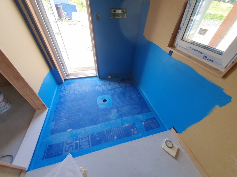 오히려 아래와 같이 본격적인 방수목적의 투습방수지를 바닥에 깔고 벽면은 수지계도막방수를 하는 경우는 있었습니다.