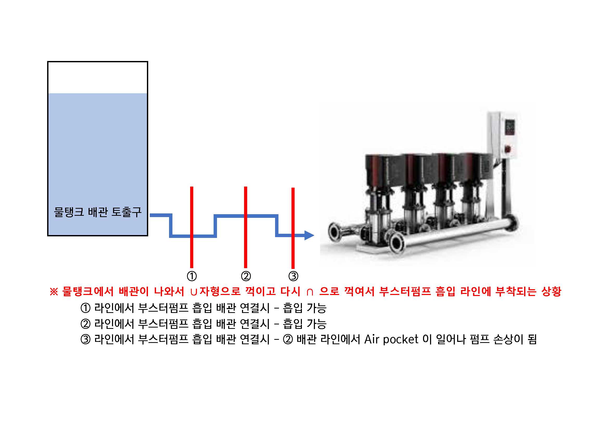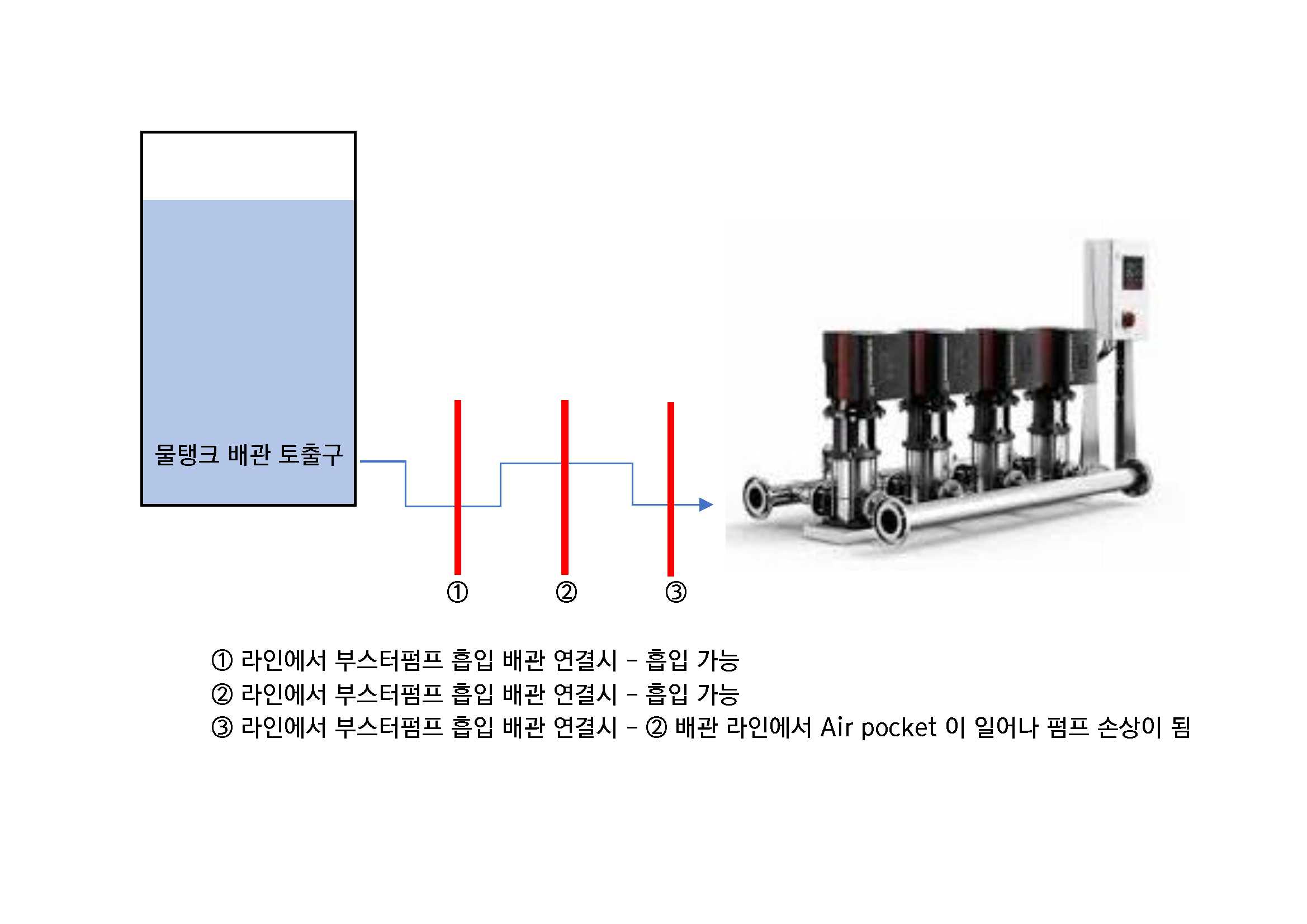 2. 첨부 사진으로 보시면 ①, ②라인에서 부스터펌프 흡입 배관에 물리면 문제없이 흡입이 가능하지만, 다시 내려오는 배관인 ③라인에서 흡입배관에 물리면 ② 라인에서 Air pocket 이 일어나 흡입이 안되고 열이 발생해 펌프 손상될 것으로 사료됩니다.