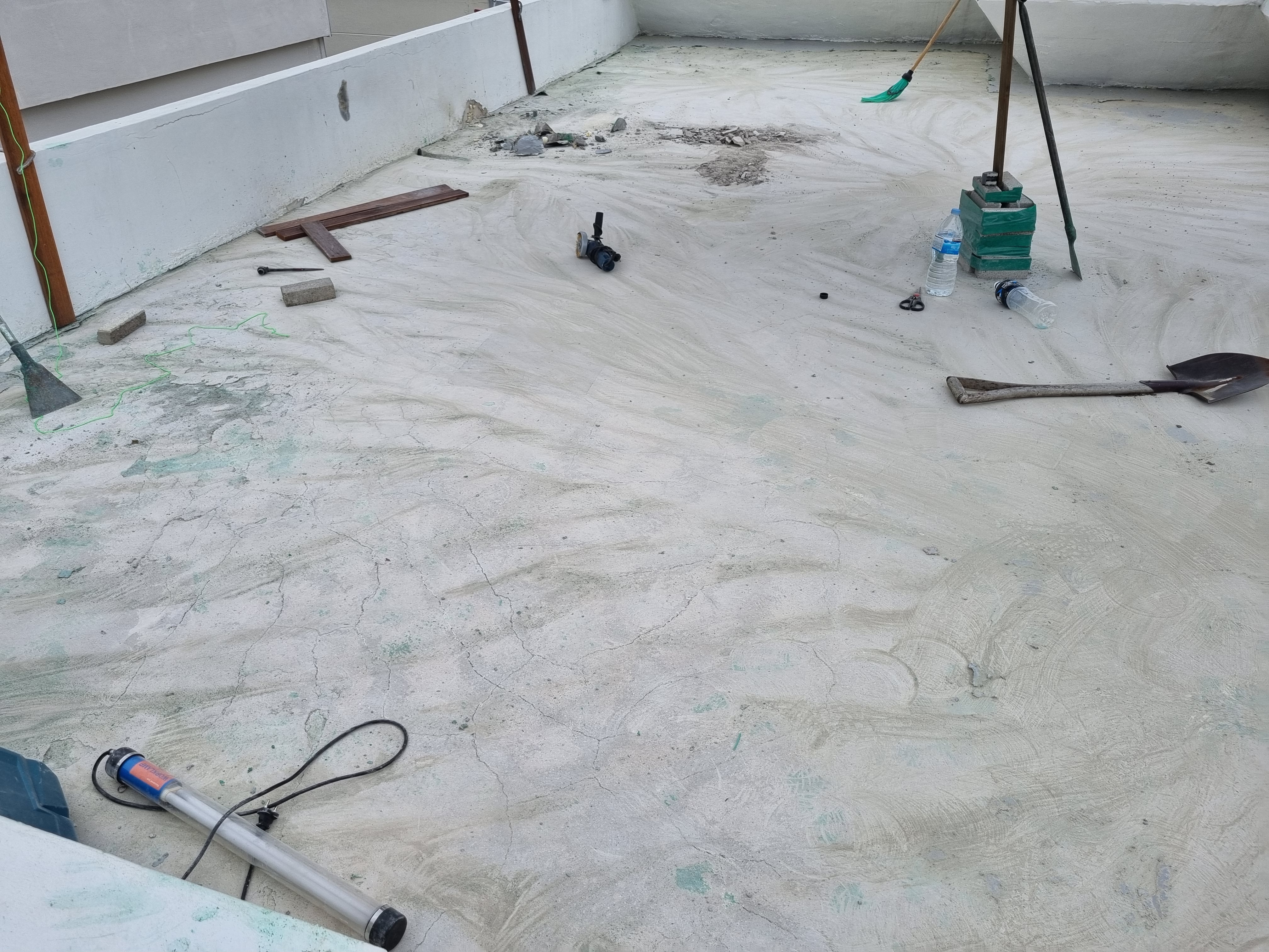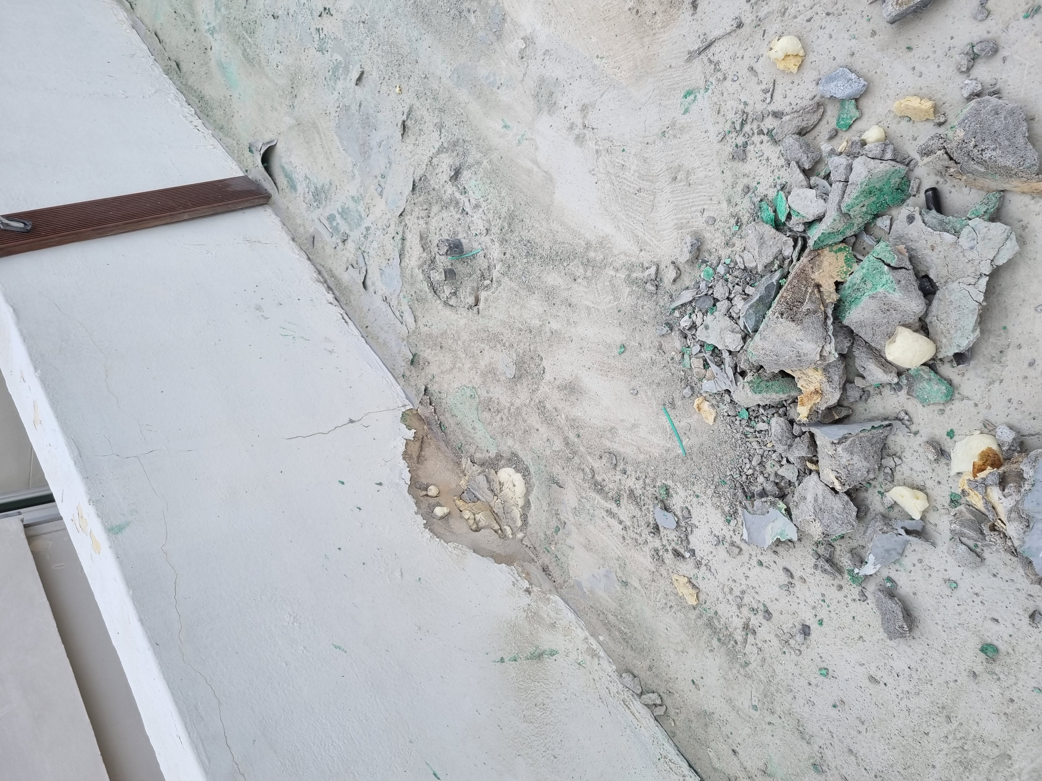 1. "몰탈을 부어놓고 그냥 작업을 끝낸것 같은 곳도 있고 바닥아래로 배관을 심어놓고 그냥 몰탈로 메워져 있었고 측면 배수구도 우레탄폼 같은것으로 막고 위에 몰탈로 도톰하게 올려져 있어 다 부셔놓은 상태인 곳"은 어느정도 정리를 하고 무수축 몰탈로 바탕면을 잡는다. "바닥과 제대로 붙어있지 않은거 같고 (갈라지고 두드려보면 떨어져있는 소리가 납니다) "이곳은 레인타이트방수 작업전날 우레탄실란트로 보수하는 방법