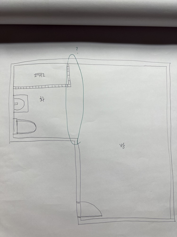 이전에 살던 사람이 욕실 - 방 사이에 있던 벽을 텄나봐요