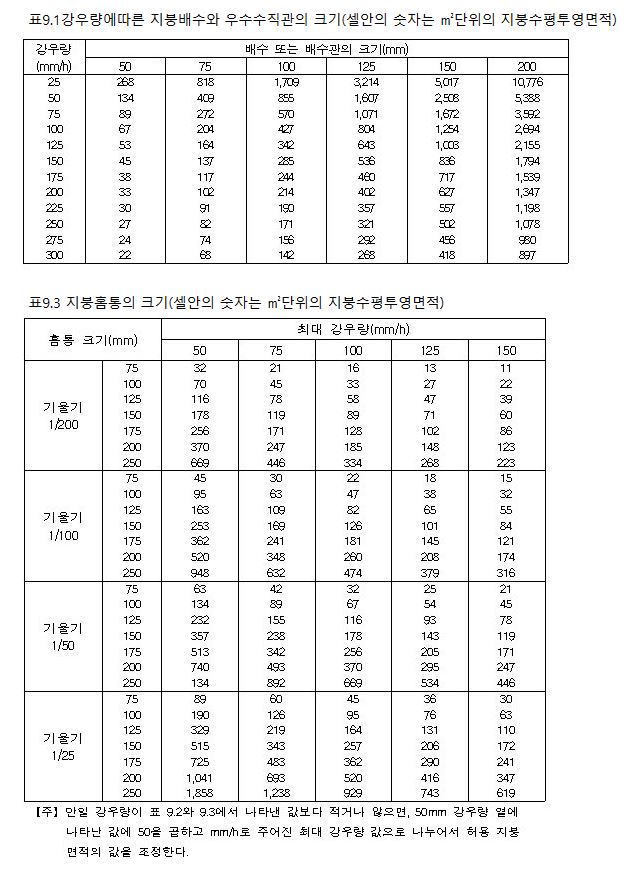 우수배관의 규격은 지붕 수평투영면적에 인접 벽면의 면적의 50%를 더하여 지역최대강우량에 따라 달라집니다. 지붕홈통의 크기도 마찬가지입니다. 아래 표를 참고 부탁드립니다.
