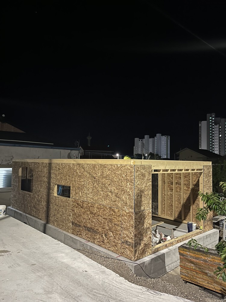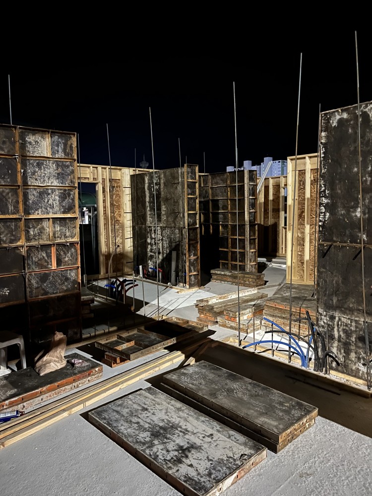 2층 바닥이 목조 장선일지 콘크리트 슬라브 일지 궁금해지네요. 벽체 거푸집 위로 철근이 없는 걸로 봐서는 슬라브는 철콘이 아닐거 같은데... 1층 벽체 제외하고 기둥+내력벽 구조에 목구조로 외벽 돌리고 2층 바닥 콘크리트 슬라브, 나머지는 목구조 형태의 일명 하이브리드(?) 목구조는 본 적이 있는데 신기하네요.