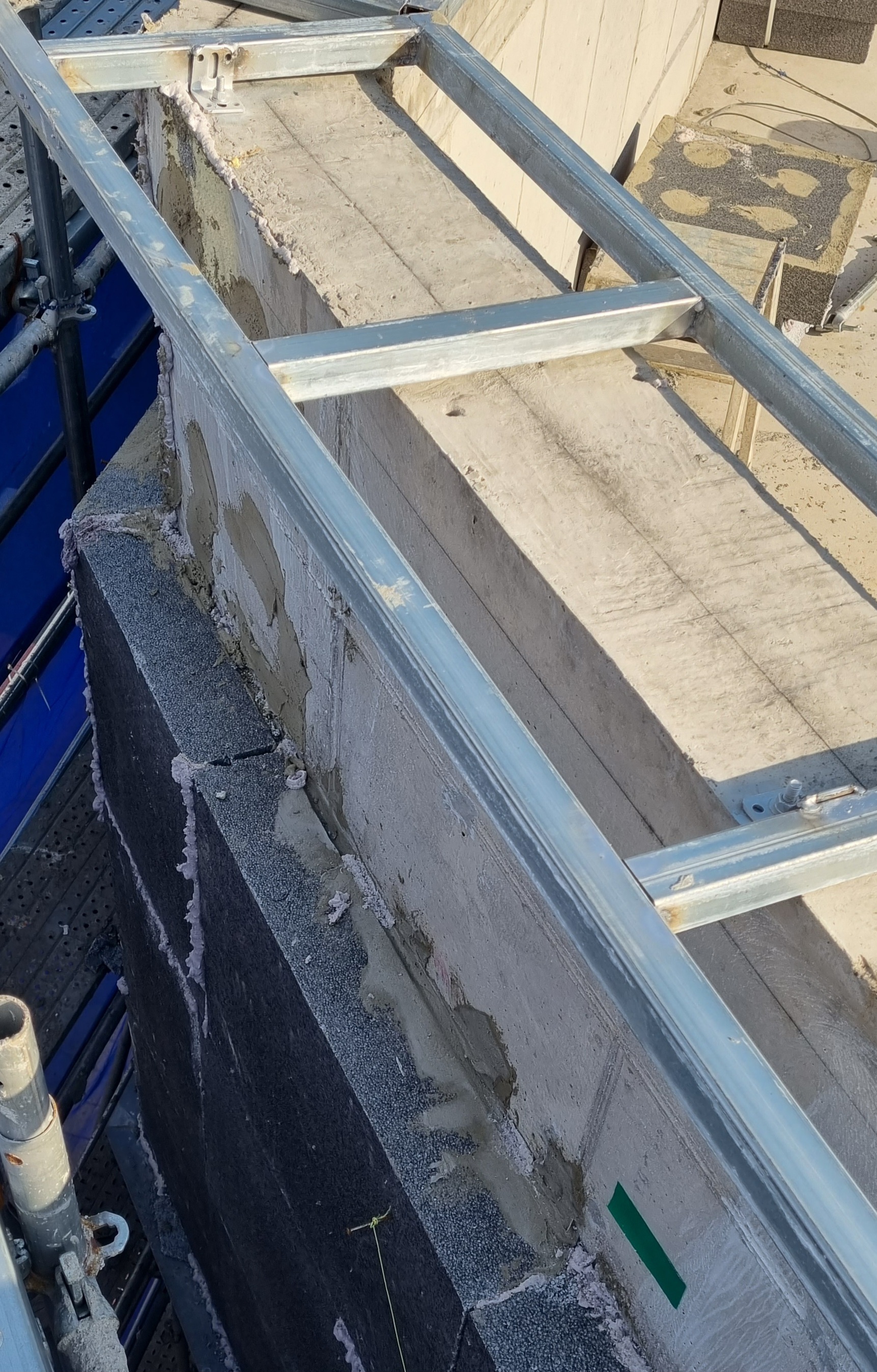 하루가 지나고 얇게 남은 몰탈이 굳은 뒤에 그 위에 다시 새로운 몰탈을 바르고 외벽에 부착하였는데요.
