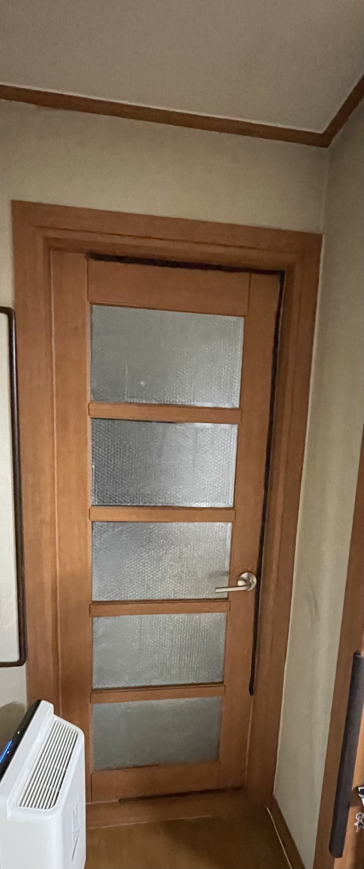 저희는 현재 확장된 거실과 비확장된 베란다 사이에 가벽이 있고 문은 타공 유리 목문 입니다. 그리고 비확장 베란다에 가벽 바로 옆에 우수관이 있고요.