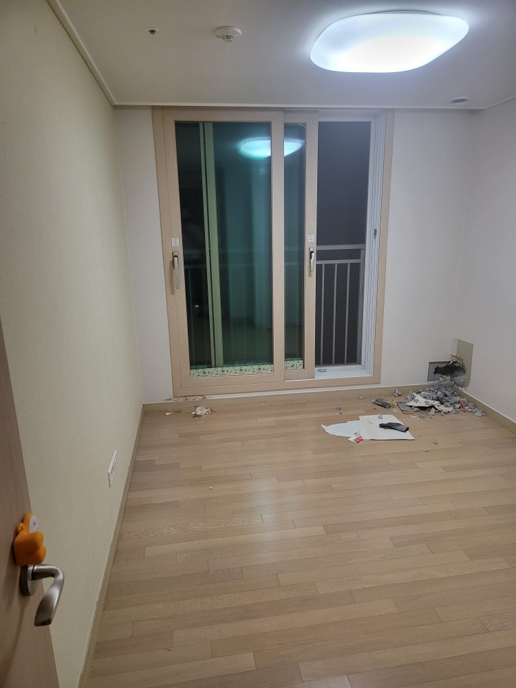 사진에 보이는 창문샷시쪽과 오른쪽 벽면이 외벽인 구조로 방에서 곰팡이 냄새가 심하여 ㄱ자 외벽 두면 모두 단열재 시공 예정입니다.