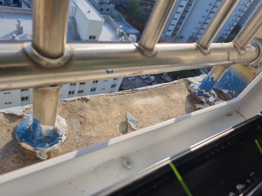 공사 중 업체가 베란다 난간 하부에 있던 페인트/실리콘((정확히 뭐라 불렸는지 기억이 안 나네요) 방수층을 제거하여 난간 하부의 콘크리트가 노출된 상태가 되었습니다.