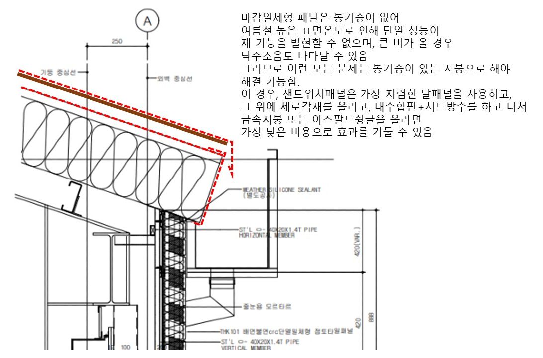 이 경우, 샌드위치패널은 가장 저렴한 노란색 철판만 붙어 있는 날패널을 사용하고, 그 위에 세로각재를 올리고, 내수합판+시트방수를 하고 나서 금속지붕 또는 아스팔트슁글을 올리면 가장 낮은 비용으로 효과를 거둘 수 있음