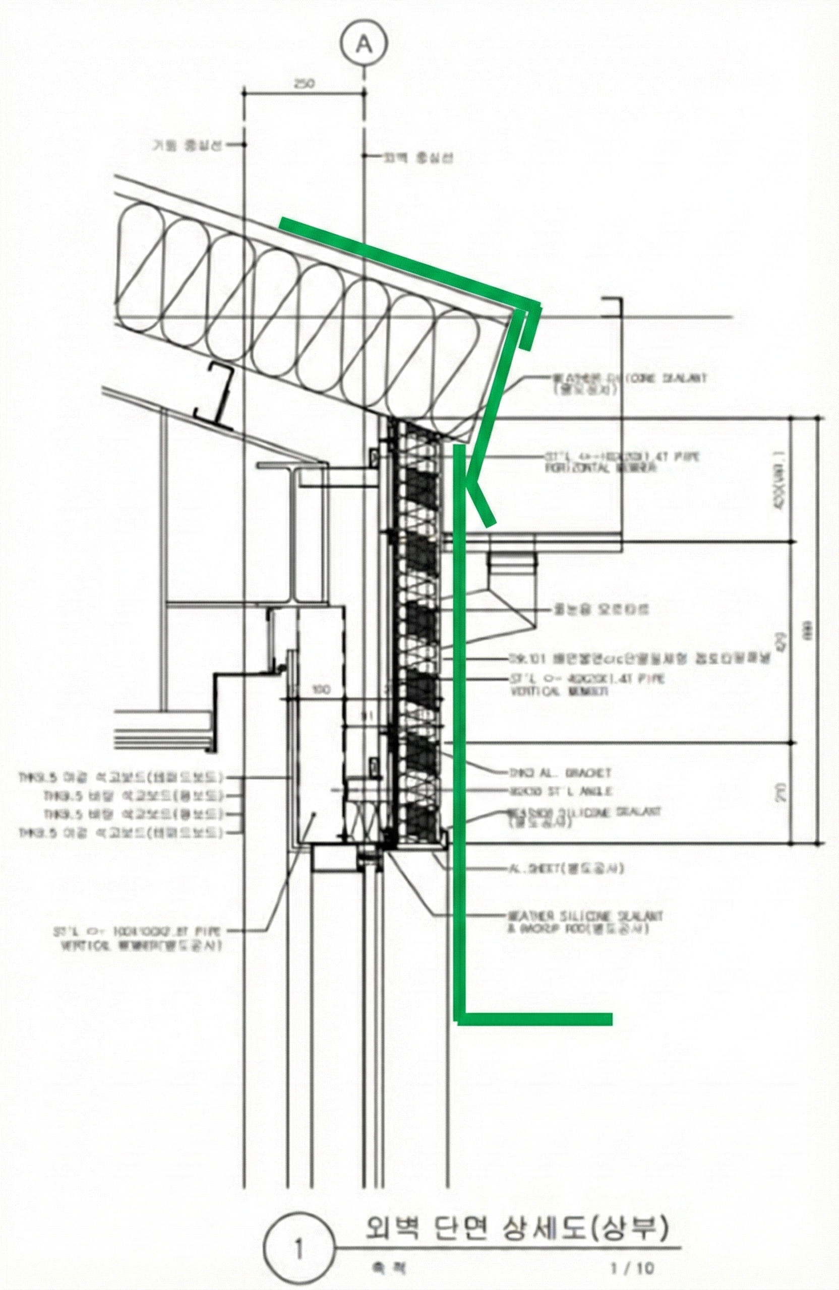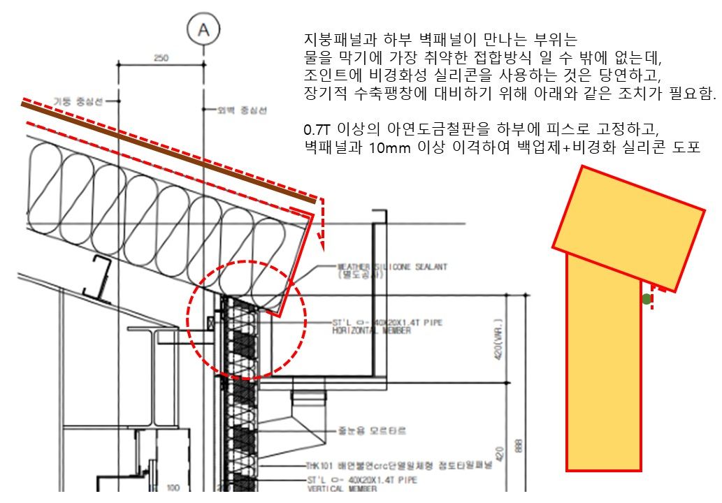 위험: 도면을 보면 지붕이 벽을 덮고는 있지만, 그 틈새를 오직 실리콘 한 줄로 막고 있습니다. 강한 바람을 동반한 비가 오면, 실리콘의 아주 미세한 바늘구멍 같은 틈으로도 빗물이 강제로 밀려 들어갑니다.