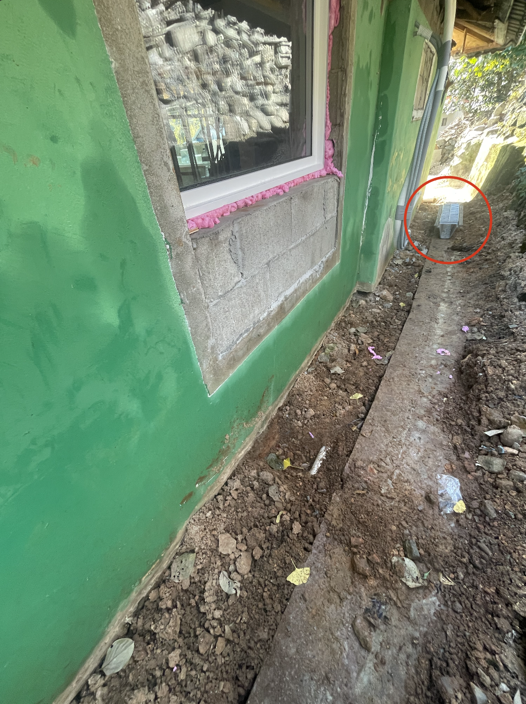 집 측면으로 배수로 작업이 허술하게(?) 되어있고 집 뒷면은 바닥을 약간 경사로를 줘서 물이 측면 배수로로 흐르게만 공사 되어있어요.