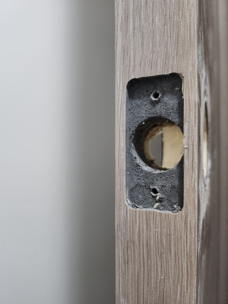 사진에 보이는 물질은 나무이며, 문의 내부가 단열재로 채워져 있는지를 확인해야 한다면 다른 곳에 타공을 해 봐야 합니다.