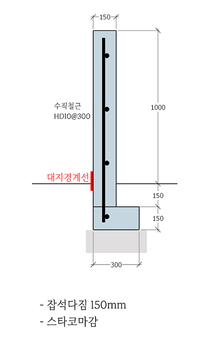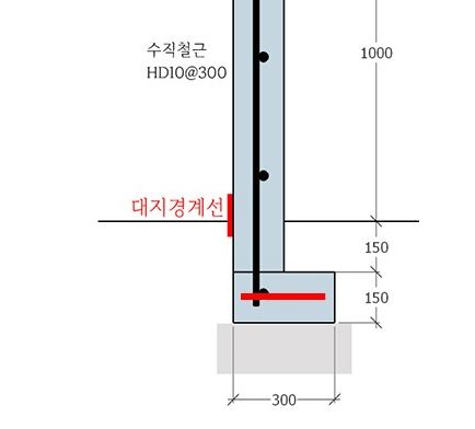 담장을 HD10@300 정도로 철근보강해서 세로철근을 기초에 연결하고요.