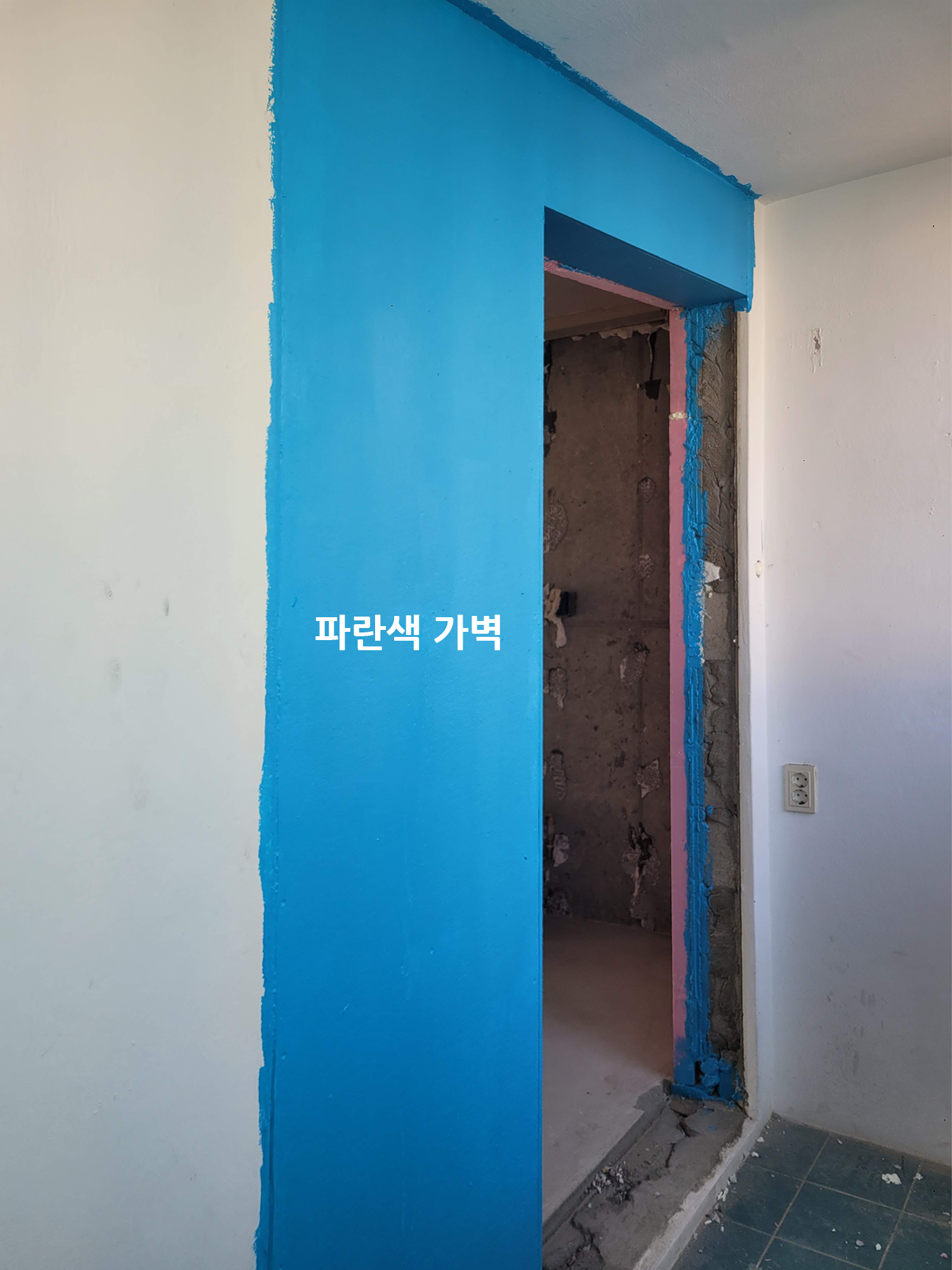 추천시공 발코니쪽에서 촬영한 사진입니다. 파란색 부분으로 칠한 부분이 가벽을 한 부분입니다. 투바이포로 시공을 했고요. 파란 페인트는 아덱스WPM003입니다. 아쿠아디펜스와 비슷한 제품입니다. 제가 시공한 순서를 발코니쪽에서부터 말씀드리겠습니다. 아덱스2회->프라이머3회->시멘트보드9mm(스텐피스부착)->투바이포목상->석고보드(타카)->XPS아이소핑크(폼부착)->방습테이프->석고보드직부착의 순서로 마감되었습니다. 원래대로라면 발코니에 방수처리를 해야겠지만, 방수계획이 없어서 아쉬운대로 투바이포가 올라가는 부분에 아덱스로 살짝(?) 방수했습니다. 시멘트보드와 바닥의 아덱스로 방수한 지면에 비는 부분은 고무퍼티로 매꾸었습니다. 석고보드대신 시멘트보드를 사용한 이유는 혹시라도 내부로 들어온 습기로 인한 피해를 차단하기 위해서입니다. 저는 9mm짜리를 사용했는데 6mm짜리를 사용하세요. 9mm는 너무 무겁고, 재단하기도 힘듭니다. 꼭 석고보드를 사용해야겠다면, 일반석고보드나 방수석고보드가 아닌 전방수석고보드라는것을 사용하시기 바랍니다. 아무튼 시멘트보드위에 바른 아덱스의 역활은 방수도 있지만, 방습을 위한것이 더 큽니다. 그리고 시멘트보드와 바닥 그리고 벽면의 빈공간은 탄성이 있는 고무퍼티나 페인트가 묻는 탄성 변성실리콘으로 매꾸어 주시고 그위에 아덱스를 칠해 주시면 됩니다. 아덱스위에는 일단 수성페인트가 칠해진다고 하는데요. 탄성코트는 잘 모르겠네요. 질문주신분은 마페이에 전화하셔서 문의하시기 바랍니다. 참고로 최종마감은 페인트보다는 (매끈매끈한)타일을 추천드립니다. 관리가 훨씬 편합니다. 곰팡이나 결로가 생겼을때 제거하는것도 훨씬 편하고요.