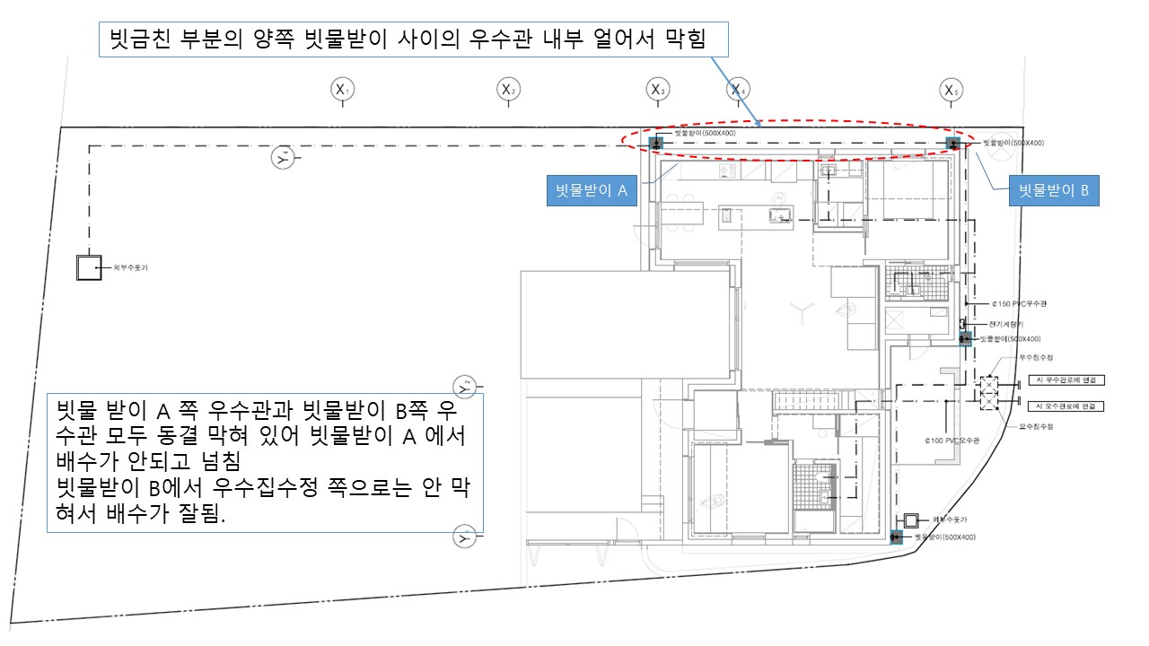 제 생각에는 역구배 이거나 우수 배관의 기울기(구배)가 너무 작아 물이 천천히 흘러 가다가 점차 동결이 되어 결국에 우수관이 막힌게 아닌가 하는 생각이 들어 구배를 확인해 보니 역구배는 아니고 구배는 제대로 주었는데 너무 적게 준 것 같습니다. 체크해 보니 우수관의 길이는 약 10.6m 이고 높이 차이(단차)는 약 60mm 입니다.