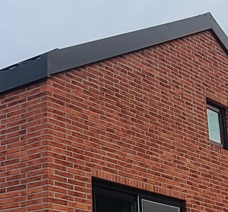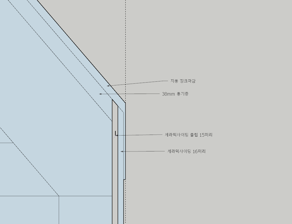 그림에서 지붕의 징크마감이 외벽의 사이딩에 접착되듯이 붙어 있는데요. 이 것을 떨어 뜨려서 공기가 들어갈 수 있게 만드는 것이 최선입니다.