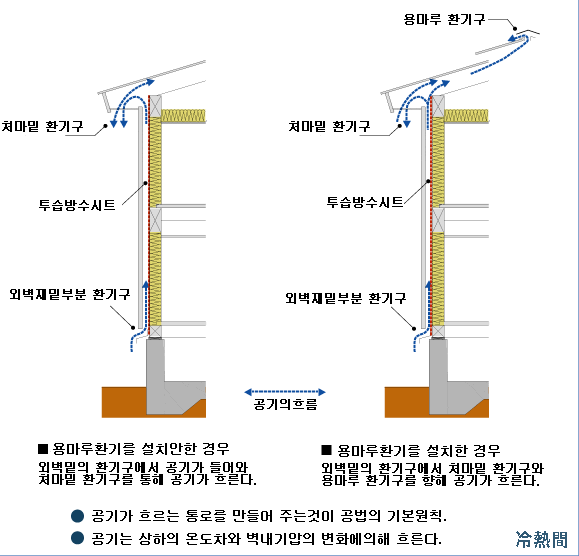 수직벽의 통기층이 지붕으로 까지 순환되는 것은 상상 속에서나 있는 일이지, 실제로는 일어나기 어렵습니다. 그리고 공기가 이처럼 각이 변해서 이동을 하면 그 결절점에 응축으로 인한 결로가 생기기도 하거든요.