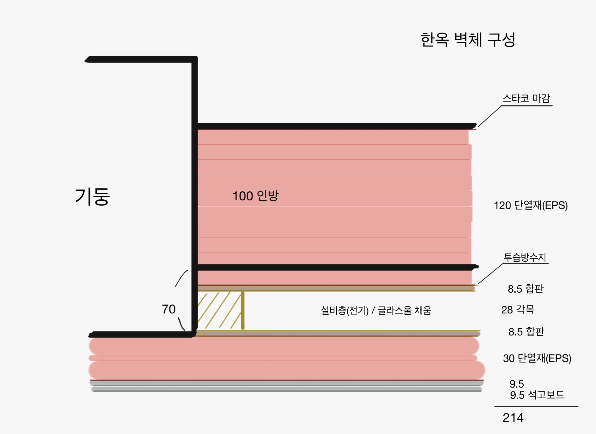 석고보드x2(19T)-가변형방습지-2x6스터드(셀룰로우즈 140mm)-OSB(11T)-32K글라스울(25T)-투습방수지-공기층(10T)-시멘트보드(6T)-스타코 마감(1.6T)=213mm