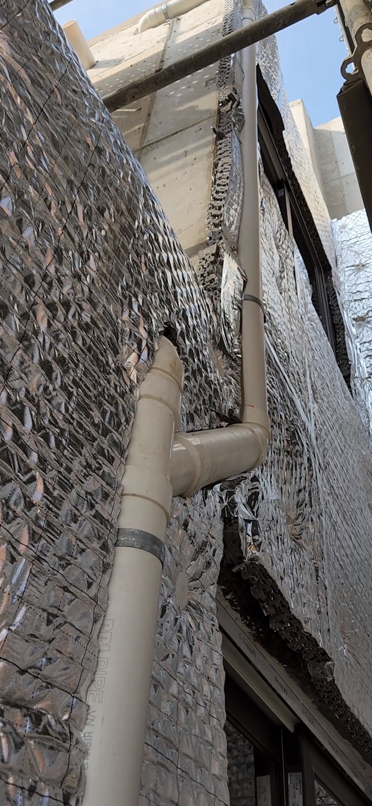 우수관이 자리는 잘라내고 그 주변으로만 단열재를 부착하고 있습니다.