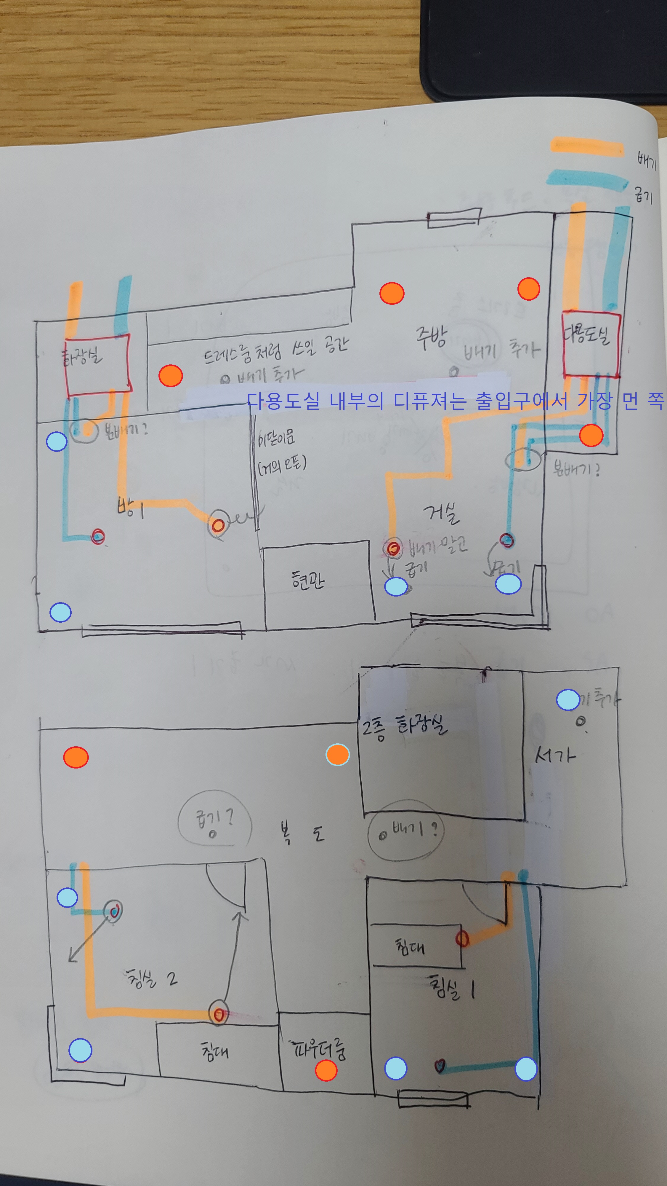 자꾸 번거롭게 해드려 죄송합니다. 말씀대로라면 화장실에 배기를 추가하는 것은 불가능하겠네요.. 마지막으로 여쭤보자면 혹시 급기구 위치는 적절할까요? 거실과 복도, 서가 등에 더 추가하는 게 나을지 궁금합니다. 늦은 시간까지 정말 감사드립니다.